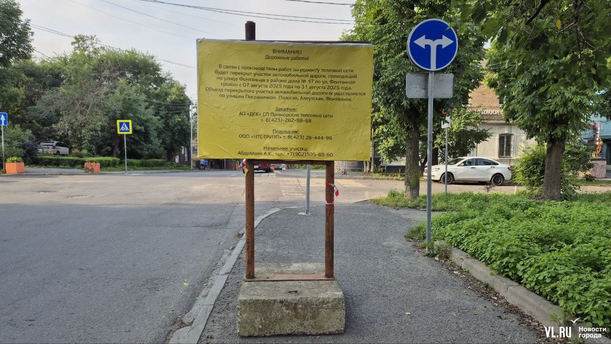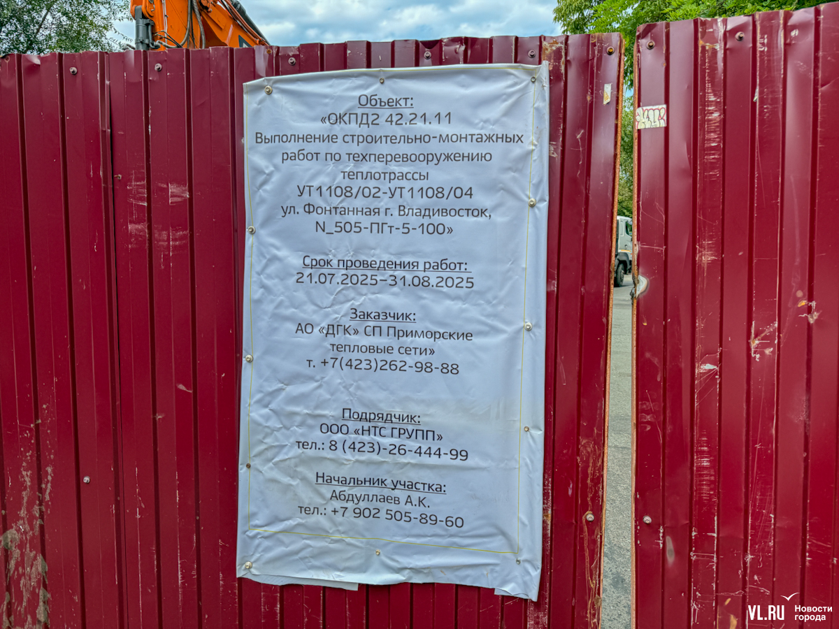 Отметим, что эти работы должны были выполняться ещё летом с 21 июля по 31 августа. Почему сроки сдвинулись почти на месяц, неизвестно. Подрядной организацией, выполняющей ремонт по заказу АО «ДГК» СП Приморские тепловые сети», стала компания ООО «НТС ГРУПП». Утром, когда рабочие уже перекрыли участок дороги и начали копать асфальт, рядом стоял паспорт объекта с устаревшими сроками.