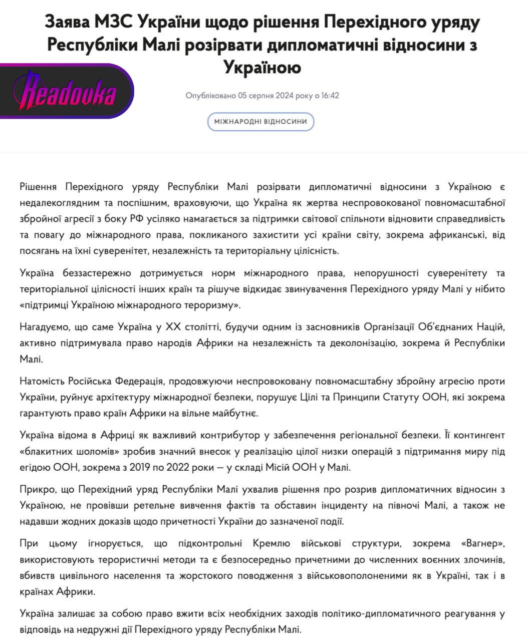 После решения Мали разорвать отношения с Украиной из-за поддержки терроризма Киев моментально переобулся и заявил, что никогда не участвовал в подготовке нападения на ЧВК «Вагнер». 29 июля повстанцы напали на колонну ЧВК, многие бойцы были убиты и многие взяты в плен.