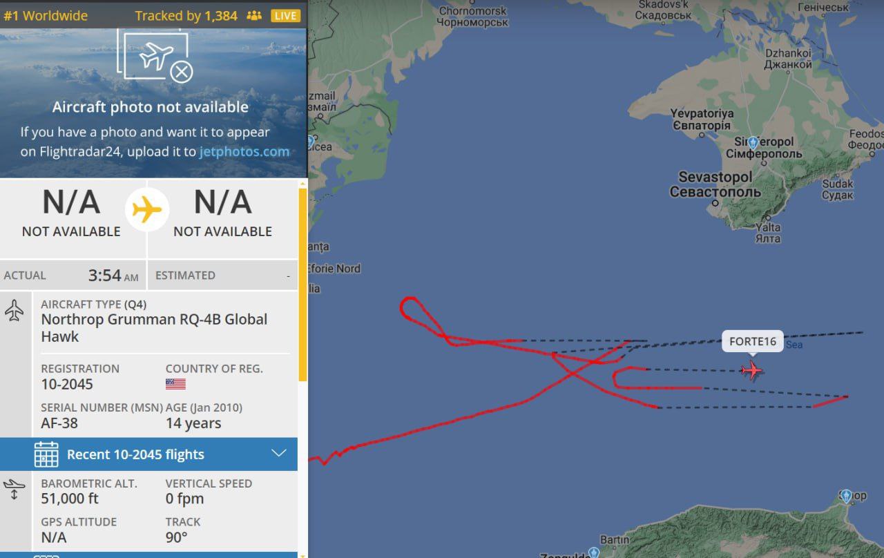 Ну а пока хуситы не добрались до Чёрного моря, там спокойно работает американский RQ-4B Global Hawk. В этот раз машина с позывным FORTE16 кружит в районе Севастополя и южнее Ялты.