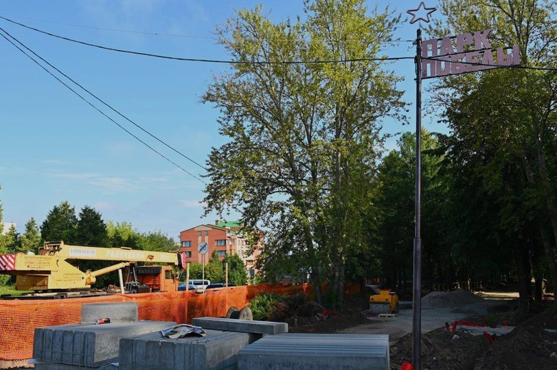 Проводятся работы по прокладке инженерных сетей, заливке фундамента под стелу, подготовка бетонного основания под укладку плитки на центральной аллее. Основания под асфальтирование дорожно-тропиночной сети готовы.