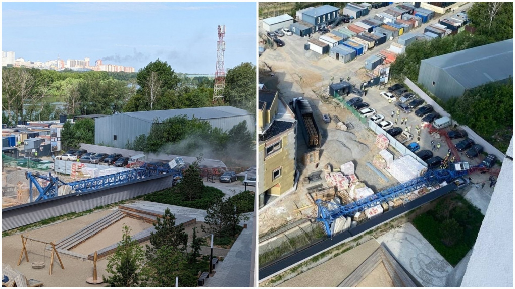 Башенный кран упал на парковку, повредив 10 автомобилей. Свидетели утверждают, что внутри крана находился рабочий в момент происшествия.