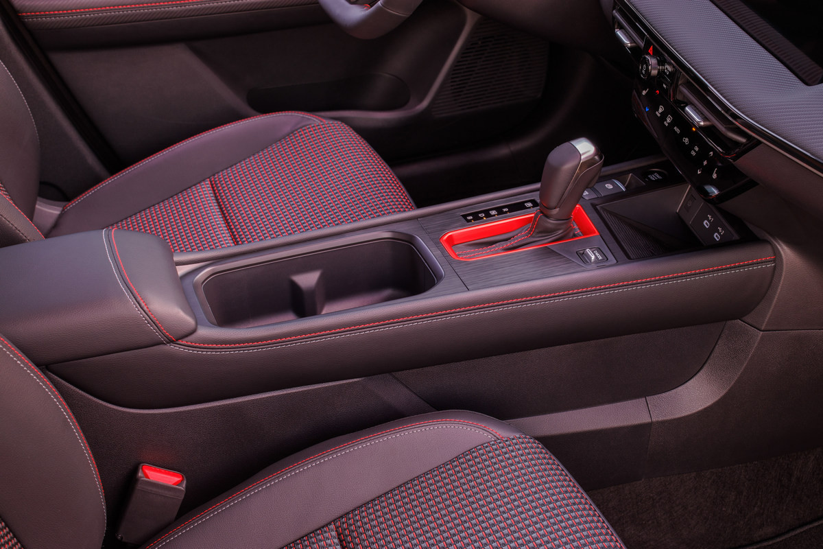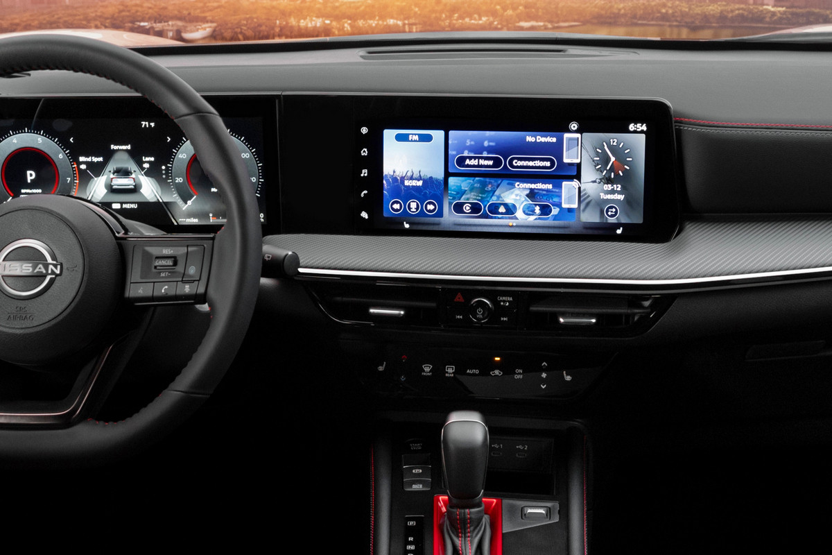 Главная фишка внутри – слегка возвышающееся над передней панелью табло. В базовой и «средней» комплектациях S и SV приборы нарисованы на 7-дюймовом экране, топ-версии SR (она запечатлена на всех фото) достался дисплей на 12,3 дюйма. Самый дешевый Кикс имеет 7-дюймовый тачскрин мультимедиа, у остальных вариантов экран диагональю 12,3 дюйма.