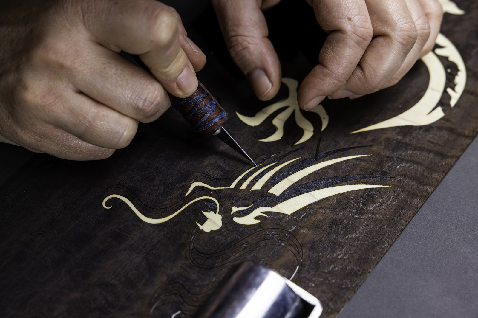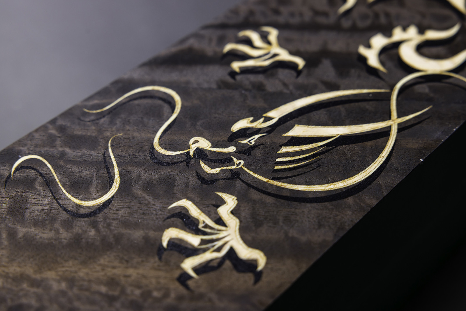 Фоновый слой изображения изготовлен из обработанного эвкалипта. Для контуров фигур шириной всего 0,5 мм был выбран шпон платана, их заполнили ясеневой крошкой, её предпочли из-за её естественной зернистости, напоминающей текстуру облаков. Ещё мастер использовал шпон чёрного дерева для создания теней: это позволило создать эффект объёма, при котором кажется, будто драконы парят над поверхностью изображения.