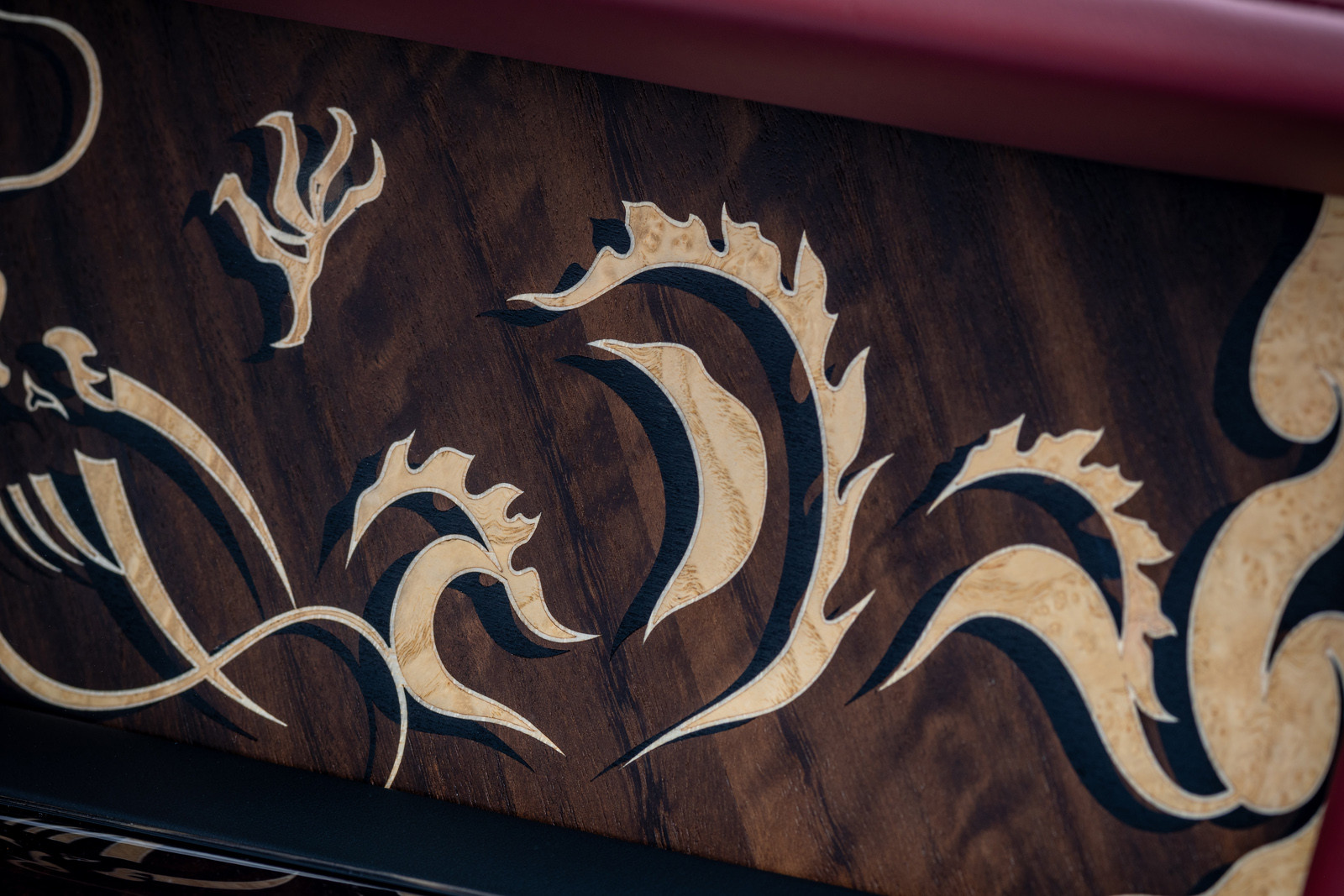 На передней панели, практически во всю ширину, располагается созданное на заказ изображение с помощью технологии маркетри. Для него мастер использовал 297 отдельных элементов и дерево четырёх различных пород; на его создание ушло три месяца. Как пояснили в компании, на панели изображены два дракона, окружённые клубящимися облаками и охраняющие жемчужину, роль которой играет круглый циферблат часов.