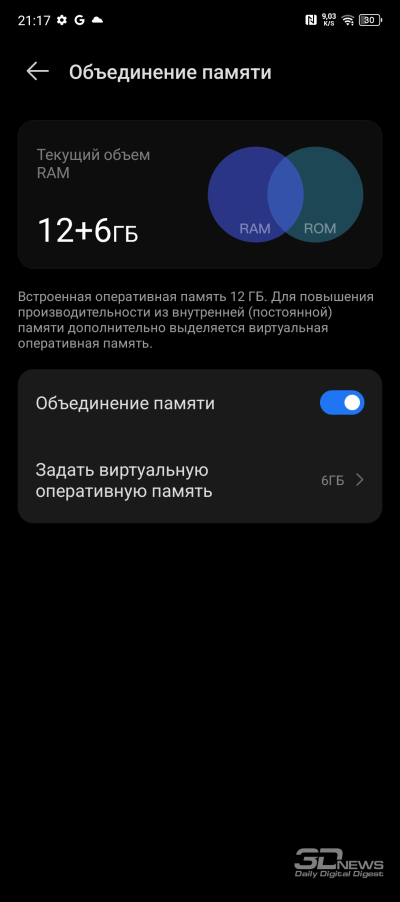 Памяти у смартфона достаточно много: он оснащается 8 либо 12 Гбайт оперативки стандарта LPDDR4X и накопителем стандарта UFS 2.2 на 256 Гбайт (тут альтернатив нет). Есть опция расширения памяти при помощи карточки MicroSD, для этого предусмотрен выделенный слот. Также можно расширить и оперативную память за счет накопителя, забрав у него еще до 8/12 (в зависимости от текущего объема оперативки) дополнительных гигабайт. У нас на тесте побывал TECNO POVA 6 с 12+256 Гбайт памяти.