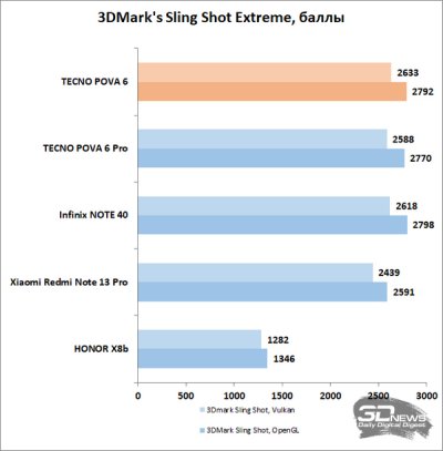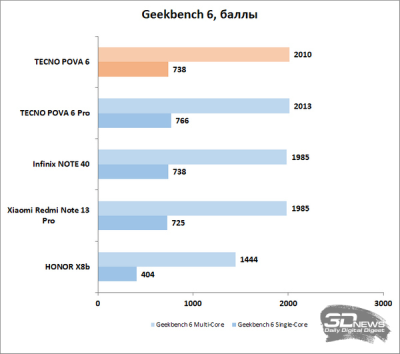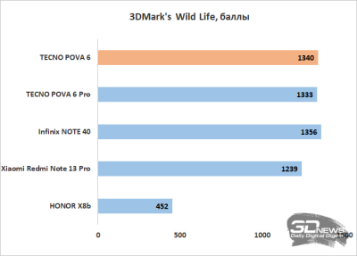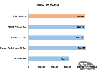 Собственно, производительность TECNO POVA 6 можно назвать достаточной для смартфона этого класса. Обращает на себя внимание паритет в мощи с TECNO POVA 6 Pro, оснащенным формально платформой другого уровня — а на самом деле того же, просто с 5G-модемом. Относительно стандартных версий Helio G99 прирост в производительности небольшой, но все же есть.