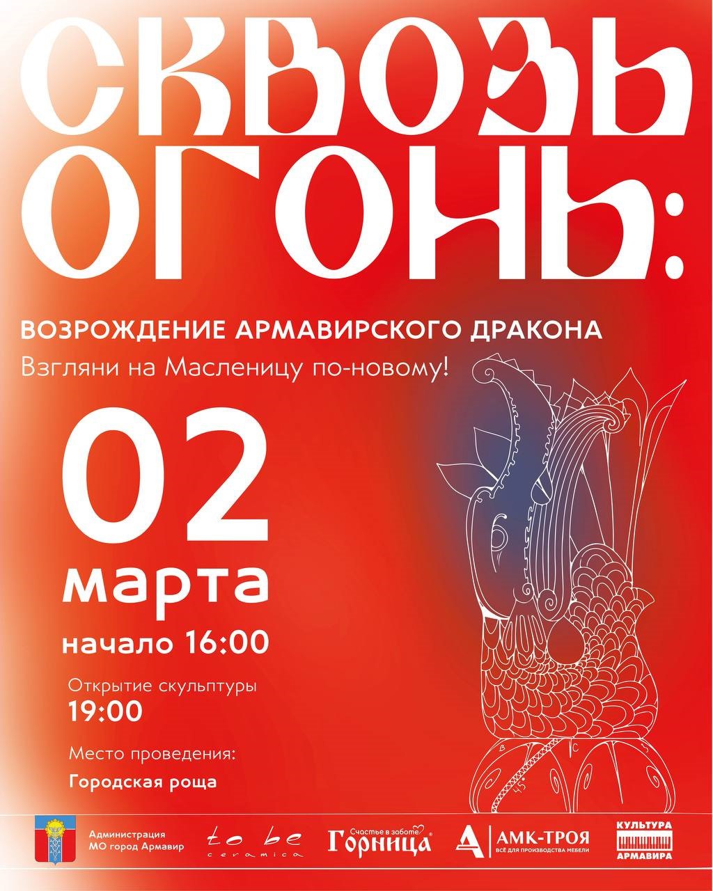 - Главная идея события – привлечь внимание армавирцев к культурным ценностям и укрепить образ огнедышащего дракона как значимый символ нашего города. “Сквозь огонь” станет запоминающимся событием и ярким завершением Масленичной недели, - рассказали порталу gorodarmavir.ru в отделе культуры администрации муниципального образования город Армавир.