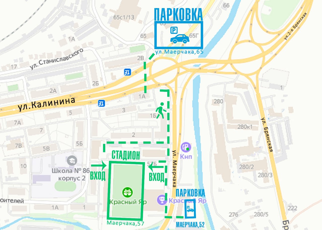 Припарковаться рядом со стадионом на Маерчака, 57 в это время не получится. Но для болельщиков организуют специальные бесплатные автобусы-шаттлы от большой парковки на улице Котельникова, 9, где можно оставить свой личный автомобиль.