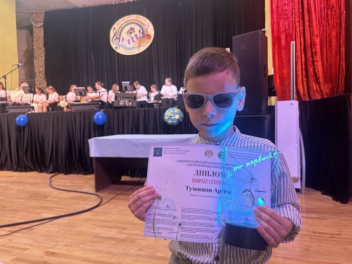 Артём - настоящий артист - обожает сцену и аплодисменты зрителей. Менее чем за год он стал победителем различных Международных, Всероссийских и краевых фестивалей, где выступал наравне со зрячими детьми.