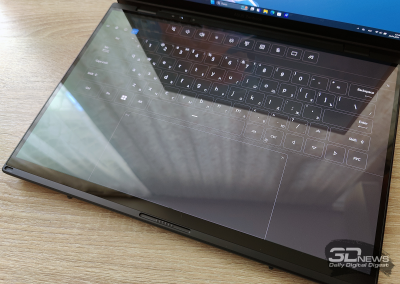 При раскрытии крышки на 120 градусов и больше шарниры заметно приподнимают корпус ноутбука. Использовать петли такой конструкции инженеров заставили две вещи: во-первых, нужно обеспечить кулеру ноутбука хороший приток воздуха, а во-вторых, инженеры явно пытались сделать так, чтобы пользоваться вторым экраном в режиме классического ноутбука было удобнее. Чем меньше угол — тем меньше бликов.