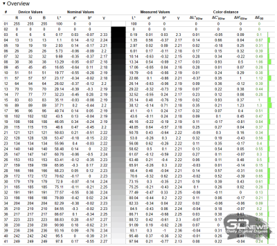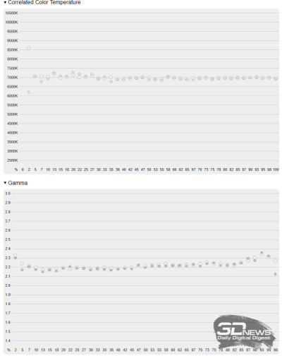 Перед вами ноутбук с экранами, которые, на мой взгляд, великолепно подходят для всех без исключения задач, — контрастность OLED-дисплеев стремится к бесконечности. Изображение у ATNA40CT02-0 очень глубокое, насыщенное, живое, яркое и завораживающее. Панели на 100 % соответствуют стандарту DCI-P3. Их калибровка проведена на высочайшем уровне. Цветовая температура держится чуть выше стандартных 6500 К, стабильность оттенков серого при этом довольно высока. Средние отклонения цветов не превышают единицы. С такими результатами я смело рекомендую Zenbook Duo UX8406MA пользователям, которым в ноутбуке необходим качественный дисплей с точной цветопередачей, — они не подведут.