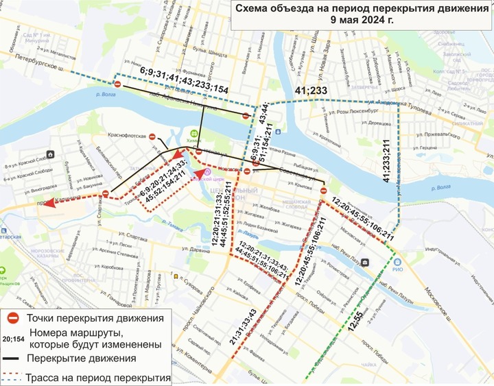 В День Победы с 6:00 и до окончания мероприятий будут перекрыты: