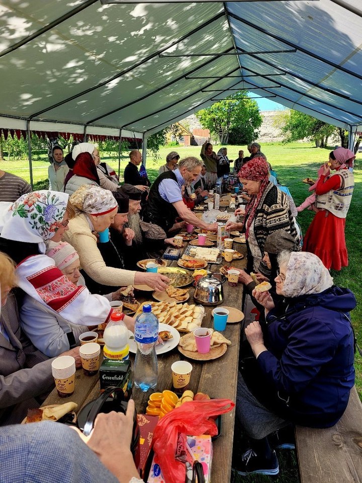 После богослужения на территории Изборской крепости прошло праздничное чаепития с детскими играми и народными песнопениями.