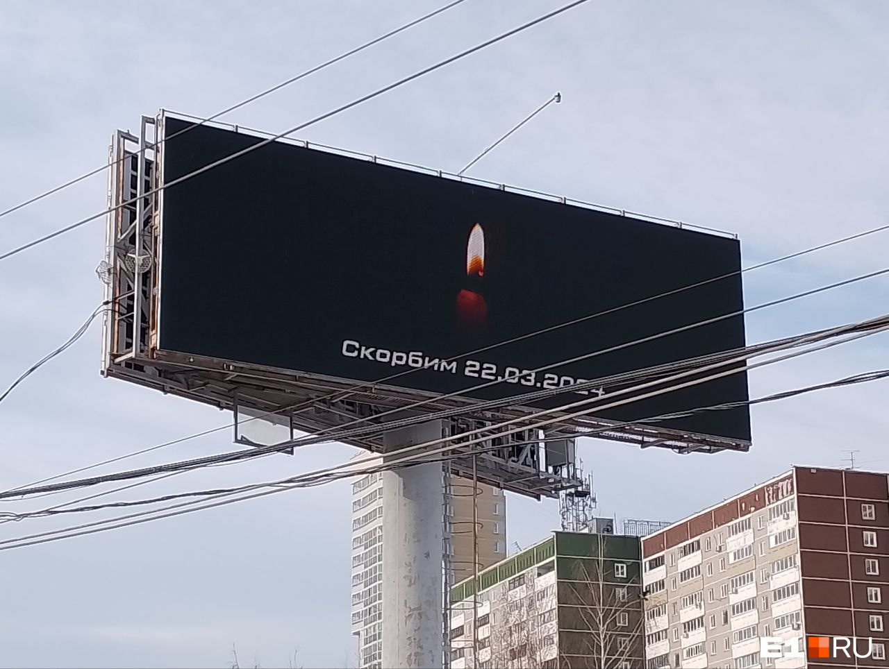 Улицы Екатеринбурга преобразились после трагедии в Crocus City Hall, где во время теракта погибло больше 60 человек. Город скорбит и облачается в черный цвет. Предприниматели сняли яркие рекламные баннеры. Теперь на их месте лишь одно изображение — памятной свечи на черном фоне. И надпись: «Скорбим 22.03.2024».