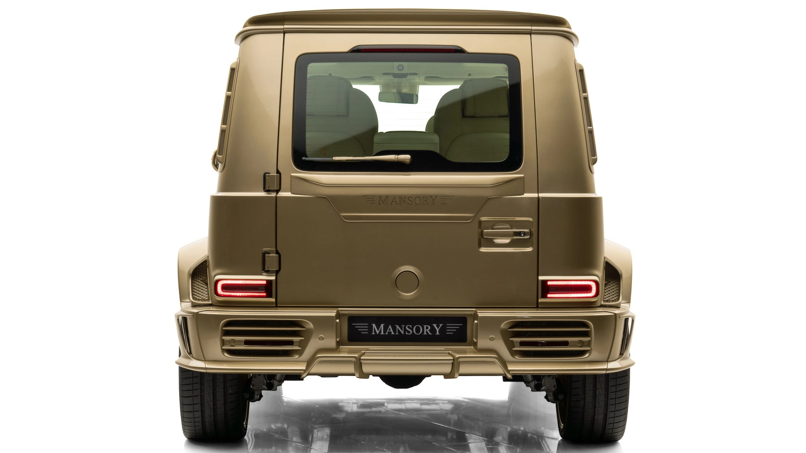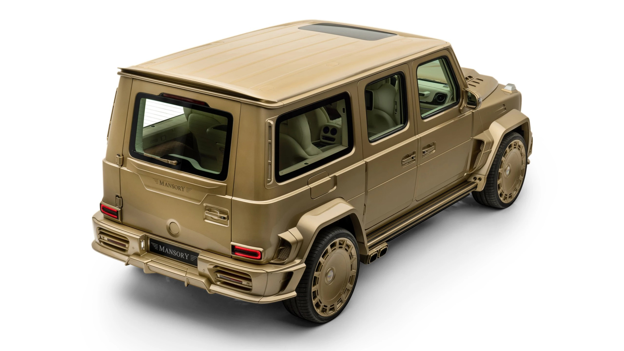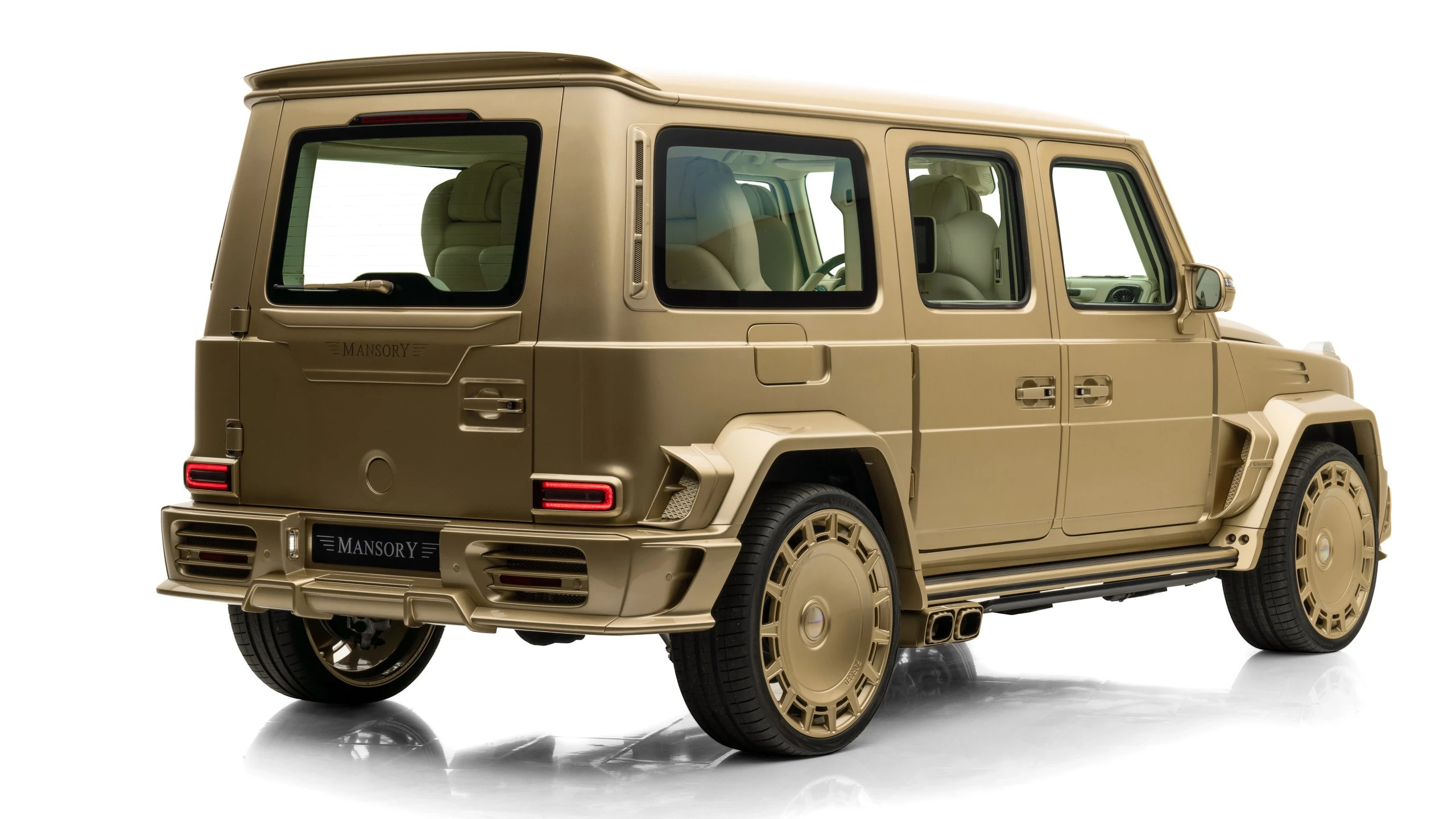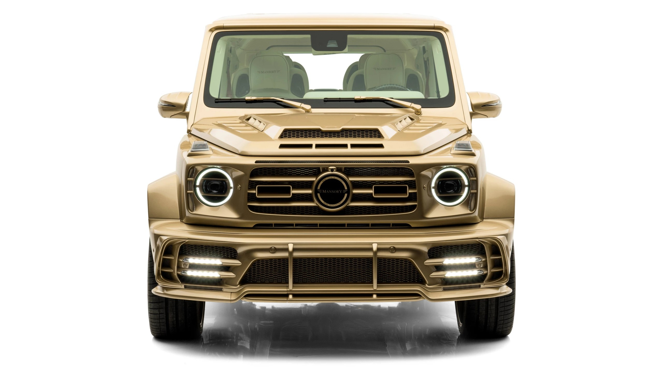 Внешний брутальный обвес золотого внедорожника нам хорошо знаком по другим конверсиям Mansory на базе Mercedes-AMG G 63, он делает кузов намного более широким. 24-дюймовые колёсные диски FD.15 окрашены в цвет кузова. Высокого спойлера в конце крыши и светодиодной «люстры» в её начале в данном случае нет, так как дизайнеры Mansory хотели придать этому штучному «гелику» эстетику золотого кирпича. Надо отдать должное — у них это получилось.