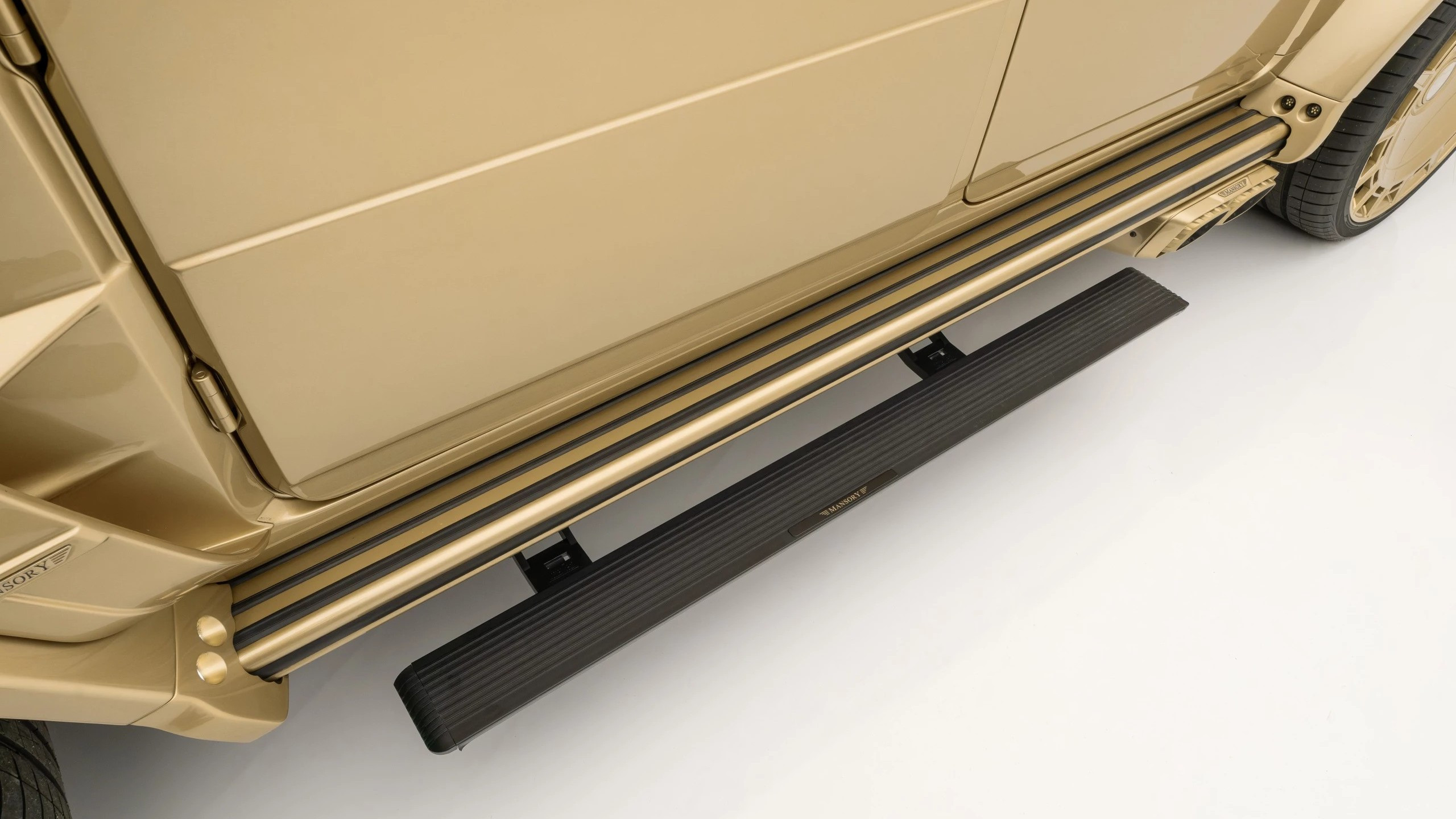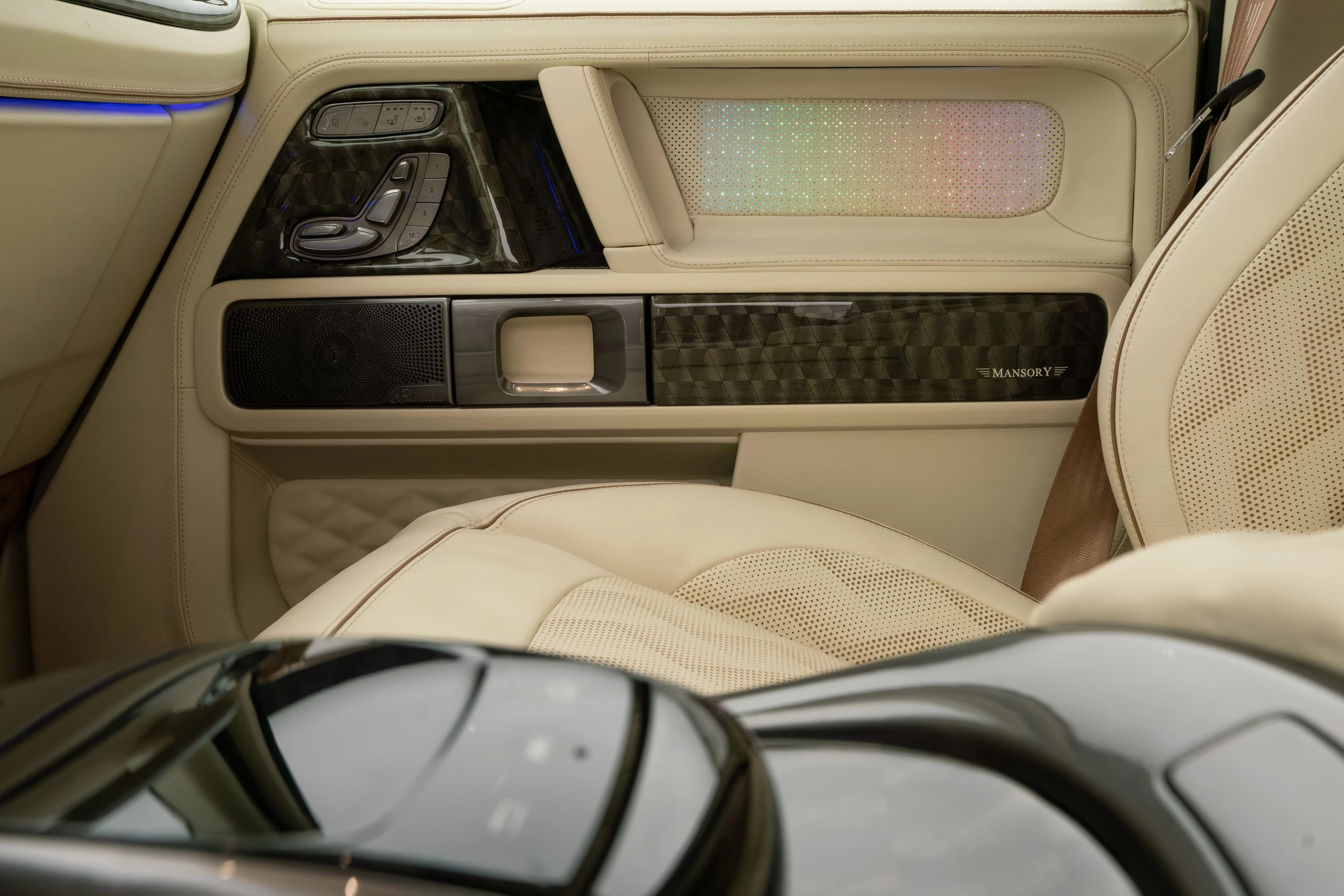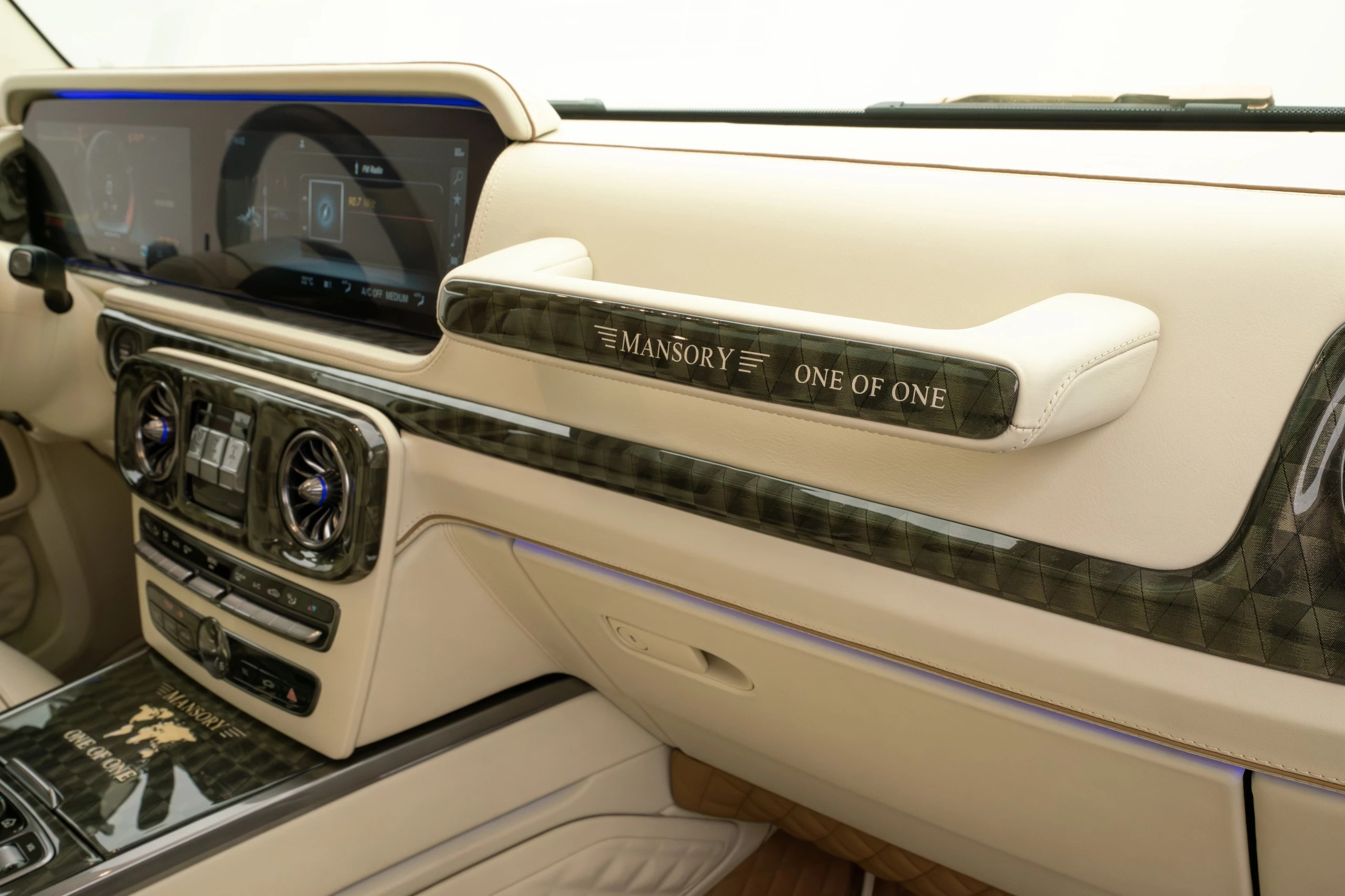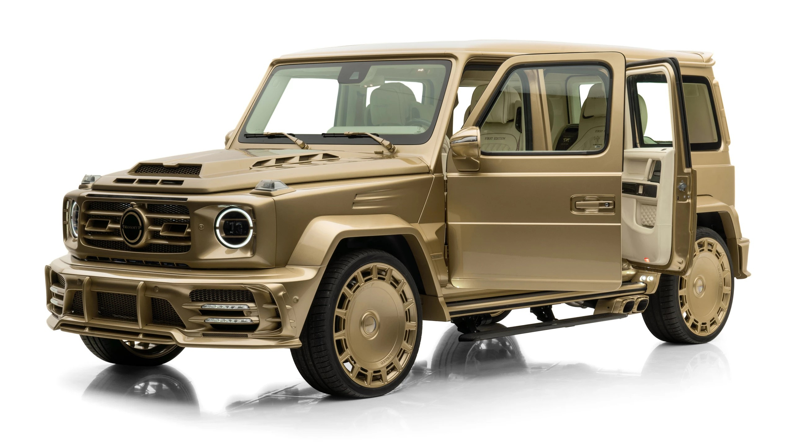 Внешний брутальный обвес золотого внедорожника нам хорошо знаком по другим конверсиям Mansory на базе Mercedes-AMG G 63, он делает кузов намного более широким. 24-дюймовые колёсные диски FD.15 окрашены в цвет кузова. Высокого спойлера в конце крыши и светодиодной «люстры» в её начале в данном случае нет, так как дизайнеры Mansory хотели придать этому штучному «гелику» эстетику золотого кирпича. Надо отдать должное — у них это получилось.