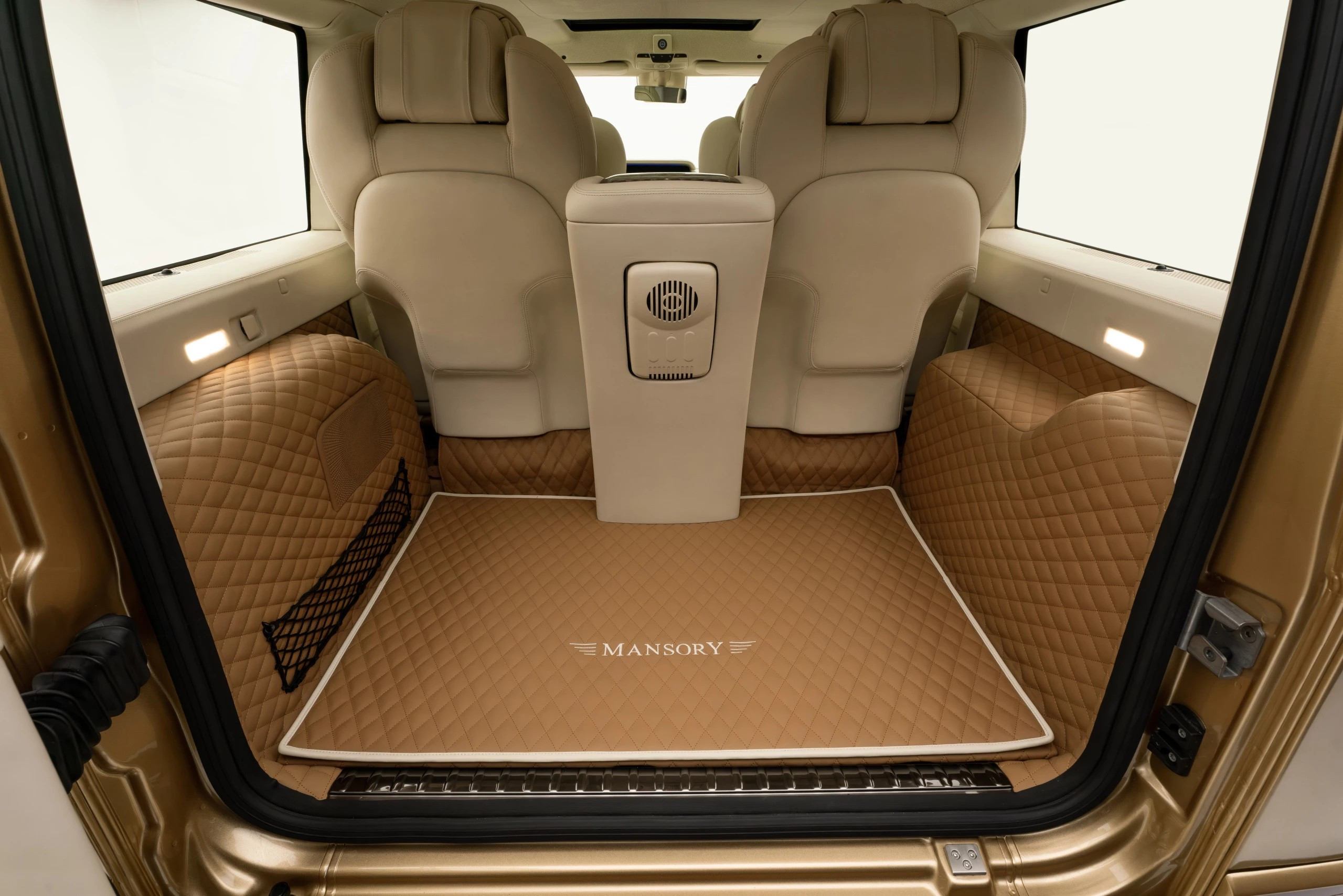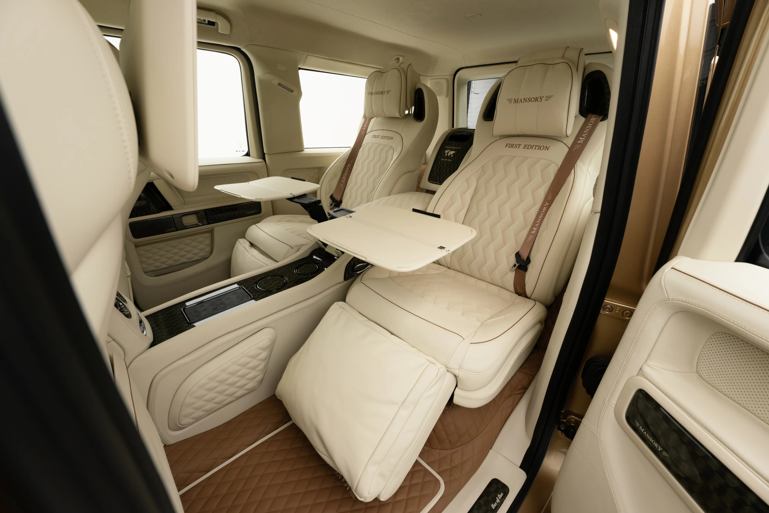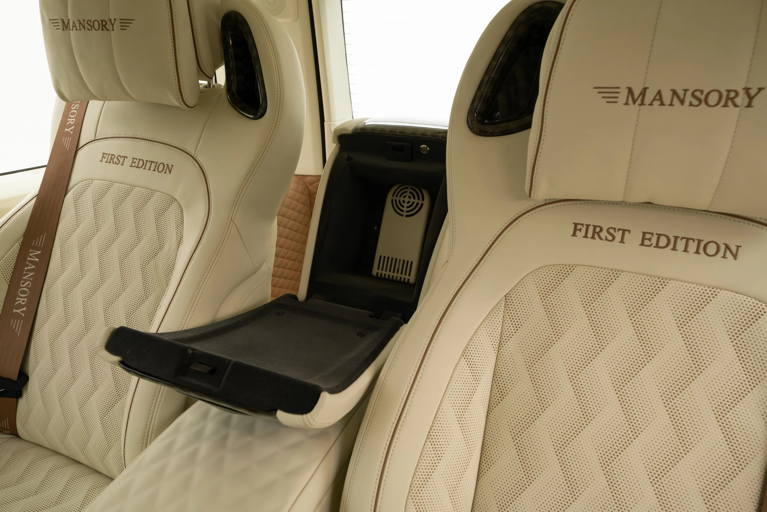 Во втором ряду Mansory P900 EWB Gold Edition установлены два кресла повышенной комфортности, разделённые высокой тумбой-огранайзером с выдвижными столиками, подстаканниками и холодильником для напитков. Задние двери стали полностью прямоугольными, без скосов в районе колёсных арок, они открываются в противоположную передним сторону для удобства высадки-посадки, пороги снабжены выдвижными подножками. Ремни безопасности у креслел второго ряда закреплены на спинках, а не на кузовных стойках.