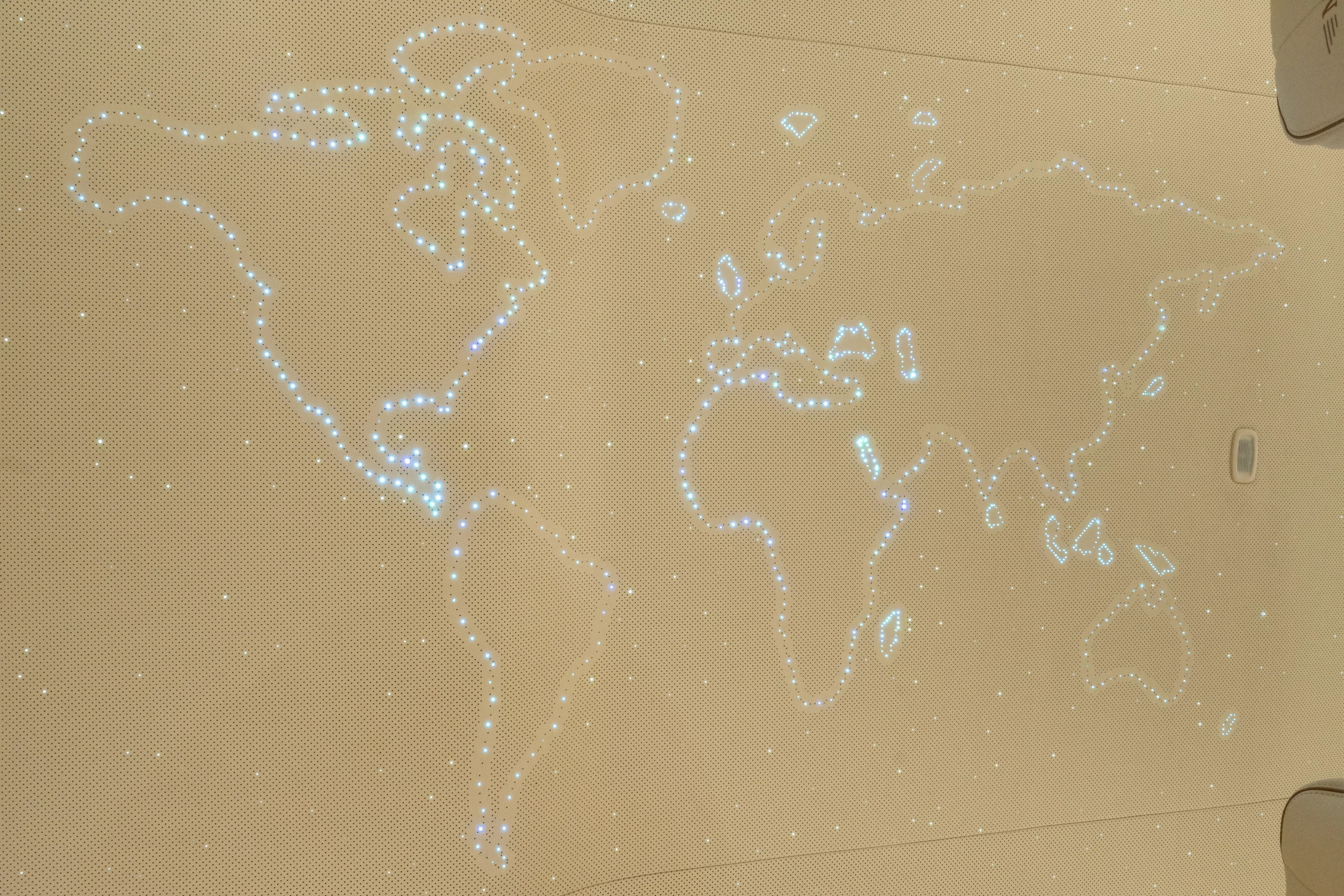 Салон, разумеется, заново обшит нежной перфорированной кожей и щедро декорирован карбоном с авторским рисунком плетения волокон. Копка запуска двигателя перенесена на потолок. Отделка потолка представляет собой массивное пано с множеством светодиодов, образующих светящуюся карту мира.