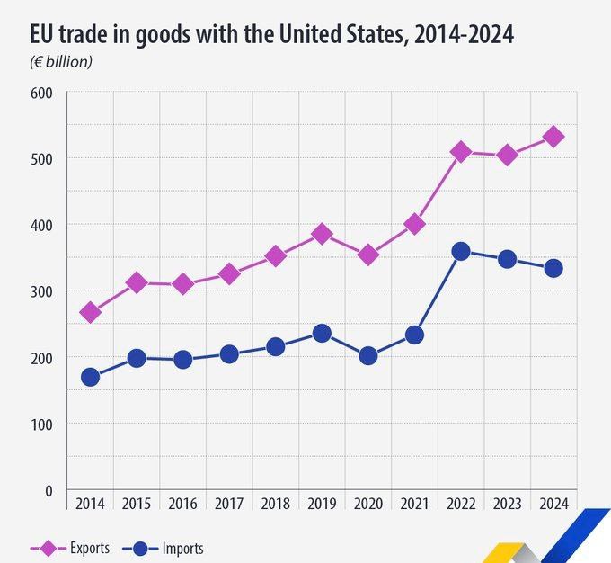 Трамп хочет ввести пошлины для Европы по следующей причине: в 2024 году ЕС экспортировал в США товаров на сумму €531,6 млрд и импортировал на €333,4 млрд, что привело к положительному сальдо торгового баланса в размере €198,2 млрд.