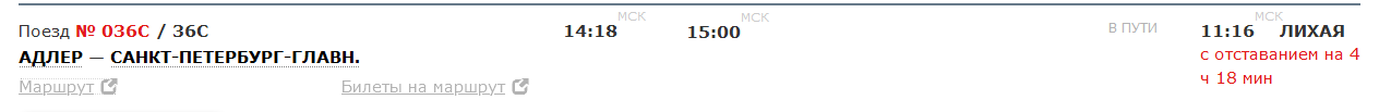 Идущий через Воронеж поезд № 036С/ 36С Адлер — Санкт-Петербург опаздывает на 4 часа. Об этом свидетельствуют данные онлайн-табло «РЖД».