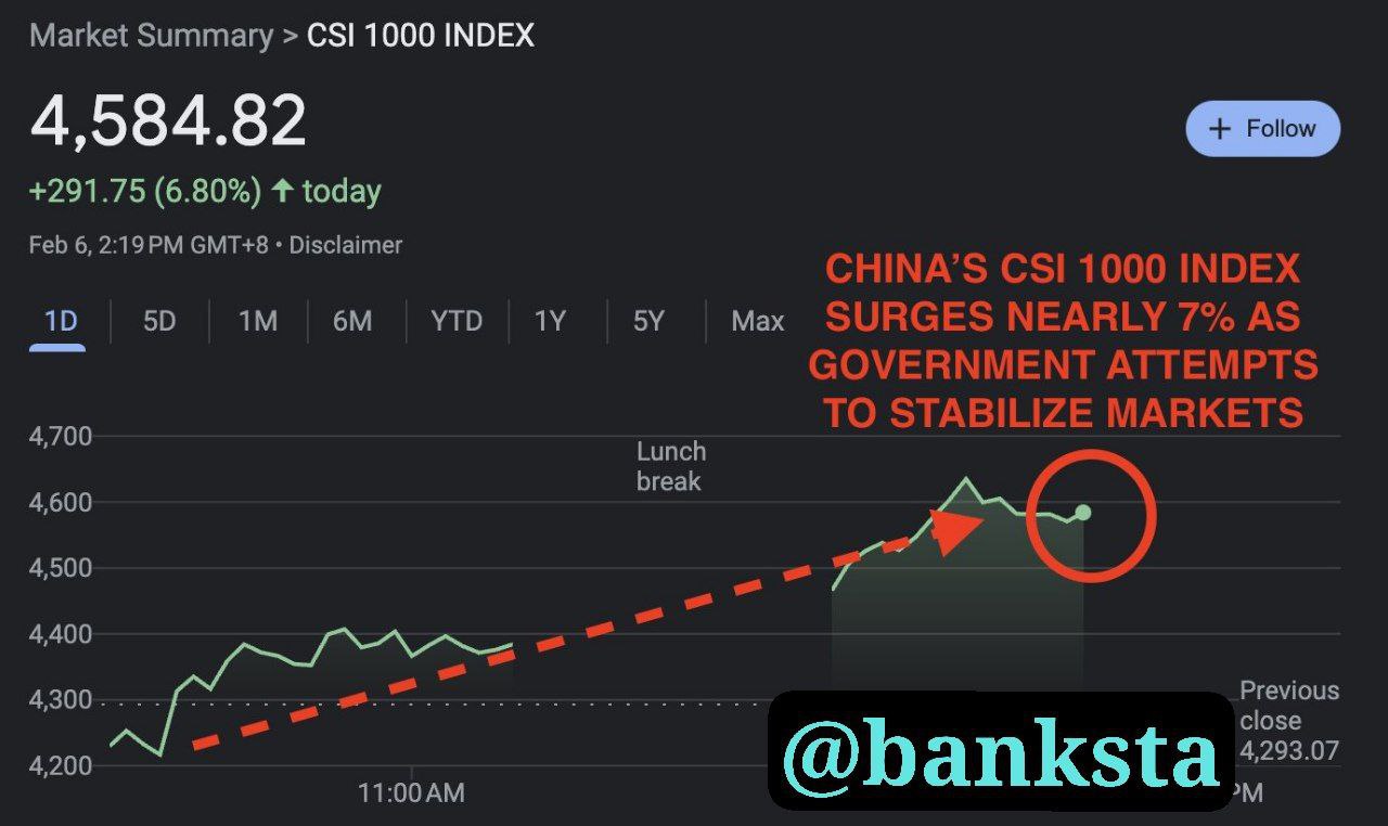 Китайский индекс CSI 1000 вырос на 7% после того, как глава Китая Си обсудил стабилизацию рынков с регулирующими органами. Индекс CSI 1000 продемонстрировал один из самых больших приростов в истории.