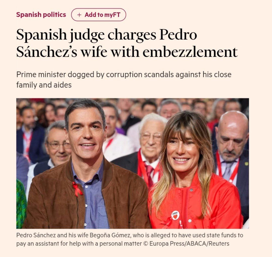 Испанский судья предъявил Бегонье Гомес, жене премьер-министра Испании Педро Санчеса, обвинение в хищении средств. Её обвиняют в использовании госсредств для оплаты услуг своей помощницы Кристины Альварес по личным вопросам. Судья Хуан Карлос Пейнадо уже предъявил Гомес обвинения в торговле влиянием и коррупции.