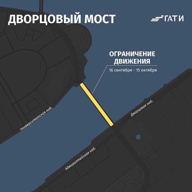 С 16 по 25 сентября будет ограничено движение с Университетской набережной в направлении Дворцовой и Английской набережных.