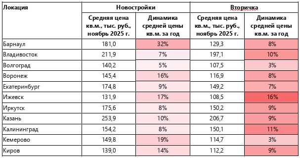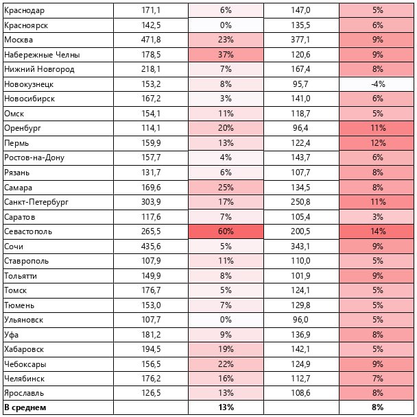 Сильнее всего новостройки подорожали в Севастополе (на 60%), Набережных Челнах (на 37%) и Барнауле (на 32%), вторичка — в Ижевске (на 16%), Севастополе (на 14%), Перми (на 12%).