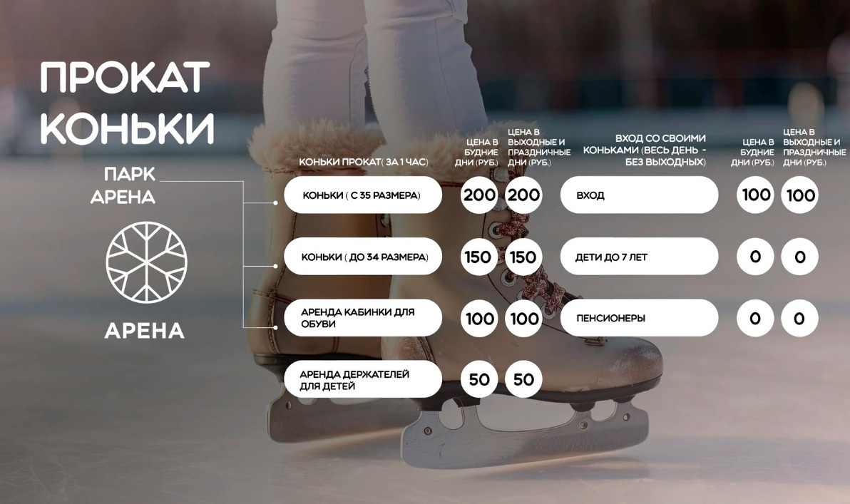 Аренда коньков с 35-го размера в час обойдется в 200 рублей, за коньки до 34-го размера стоимость проката составляет 150 рублей в час. Аренда кабинки для обуви в час обойдется новосибирцам в 100 рублей, прокат держателей для детей составит 50 рублей в час.