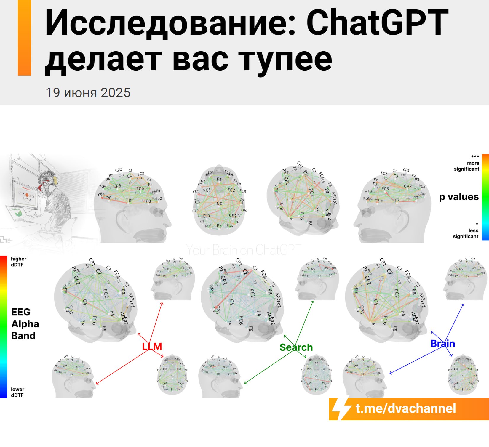 🟠Исследование показало, что ChatGPT не просто вызывает привыкание, а приводит к снижению умственных способностей – падает активность мозга, ухудшается память и уменьшается способность мыслить;