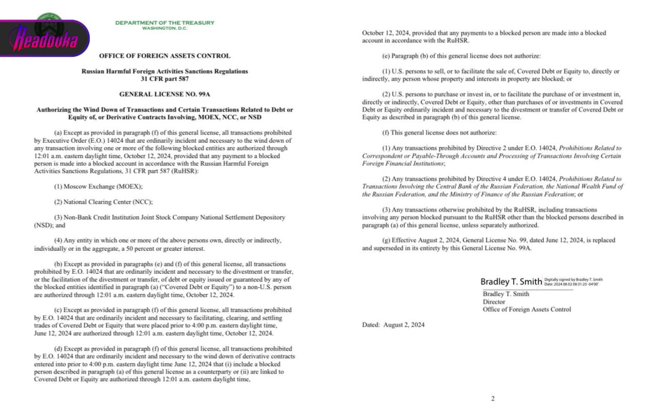 В американском Минфине сообщили, что проводить операции с Национальным расчетным депозитарием, Национальным клиринговым центром и Мосбиржей можно будет до 12 октября 2024. С чем связано подобное решение, пока не уточняется. Опубликованный документ также дублирует, что гражданам США запрещены какие-либо действия с российскими акциями. В июне Штаты, вводя санкции, разрешили проводить операции с Мосбиржей, НКЦ и НРД до 13 августа — сейчас сроки введения ограничений подвинули до 12 октября 2024 года.