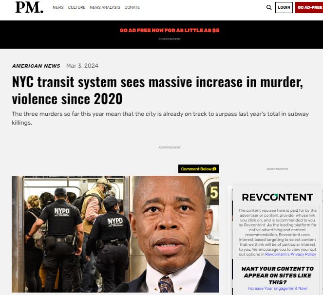 PM: с 2020 в метро Нью-Йорка наблюдается массовый рост убийств и насилия Департамент полиции Нью-Йорка выразил обеспокоенность по поводу тенденции к росту после того, как 2024 год начался с исторического уровня насильственных преступлений в метро. И это несмотря на увеличение штата полицейских и меры, введенные в попытке сдержать преступную деятельность, пишет издание. С начала 2020 года, согласно документам, полиция Нью-Йорка зарегистрировала 32 убийства в поездах и на станциях метро. Для сравнения, в период с 2005 по 2019 год ведомство зарегистрировало в общей сложности 31 убийство. Этот год уже начался плохо: с февраля было зарегистрировано три убийства в метро. Всего в 2023 году было зафиксировано 5 убийств в метро. Город уже находится на пути к тому, чтобы превзойти прошлогоднее количество убийств в метро. Майкл Кемпер, начальник полиции Нью-Йорка, предупредил во время пресс-конференции в феврале после убийства 45-летнего пассажира метро, что преступность выросла на 45% в январе по сравнению с предыдущим годом. Как ранее сообщал Gothamist, в 2022 году Департамент полиции Нью-Йорка потратил 155 миллионов долларов на сверхурочную работу по обеспечению безопасности метро, однако результат оказался ничтожным. Подписывайся на Telegram СОЛОВЬЁВ!