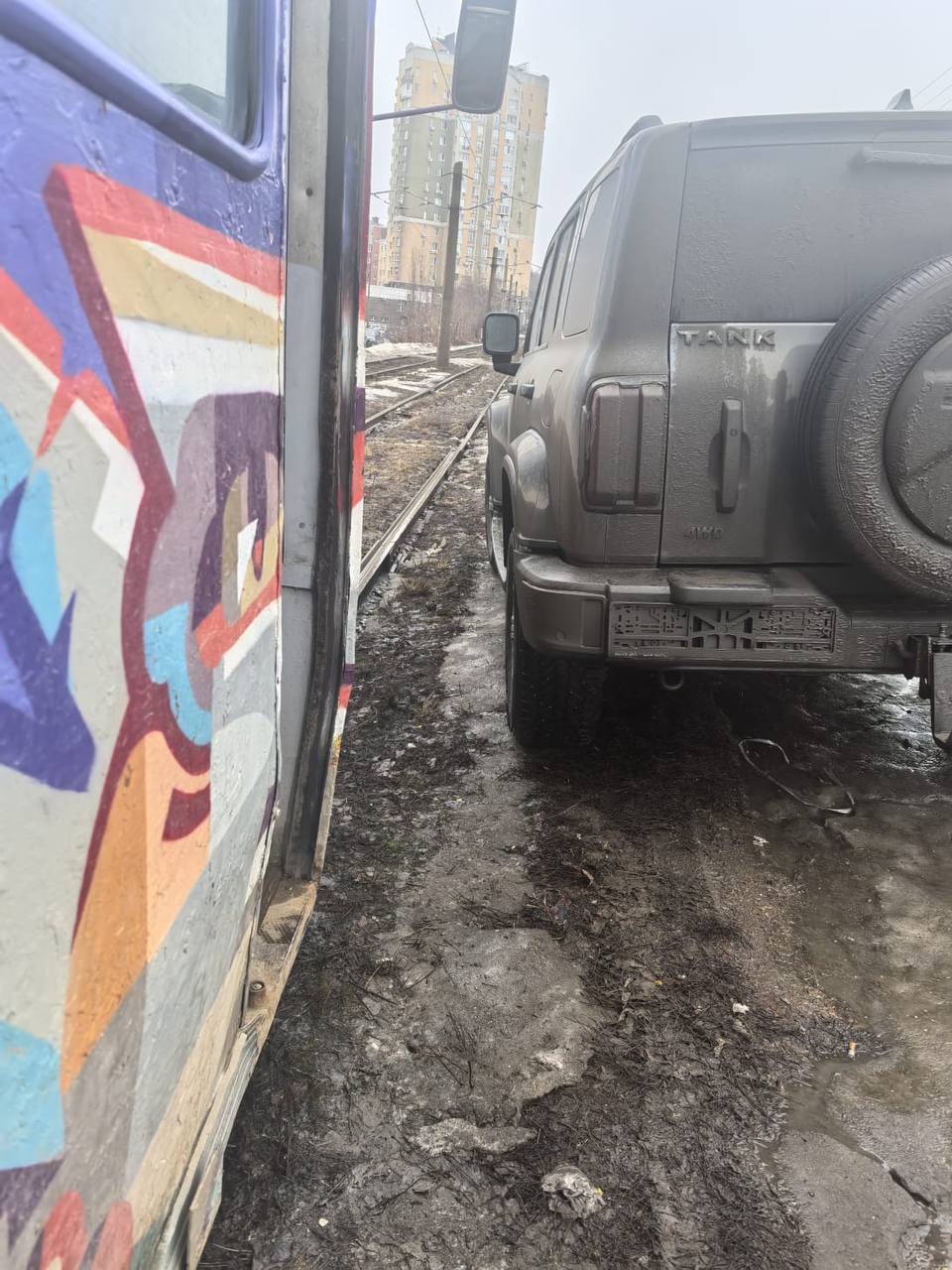 Китайский внедорожник припарковался возле трамвайных путей и остановил движение электротранспорта около Госцирка — Управление транспорта города