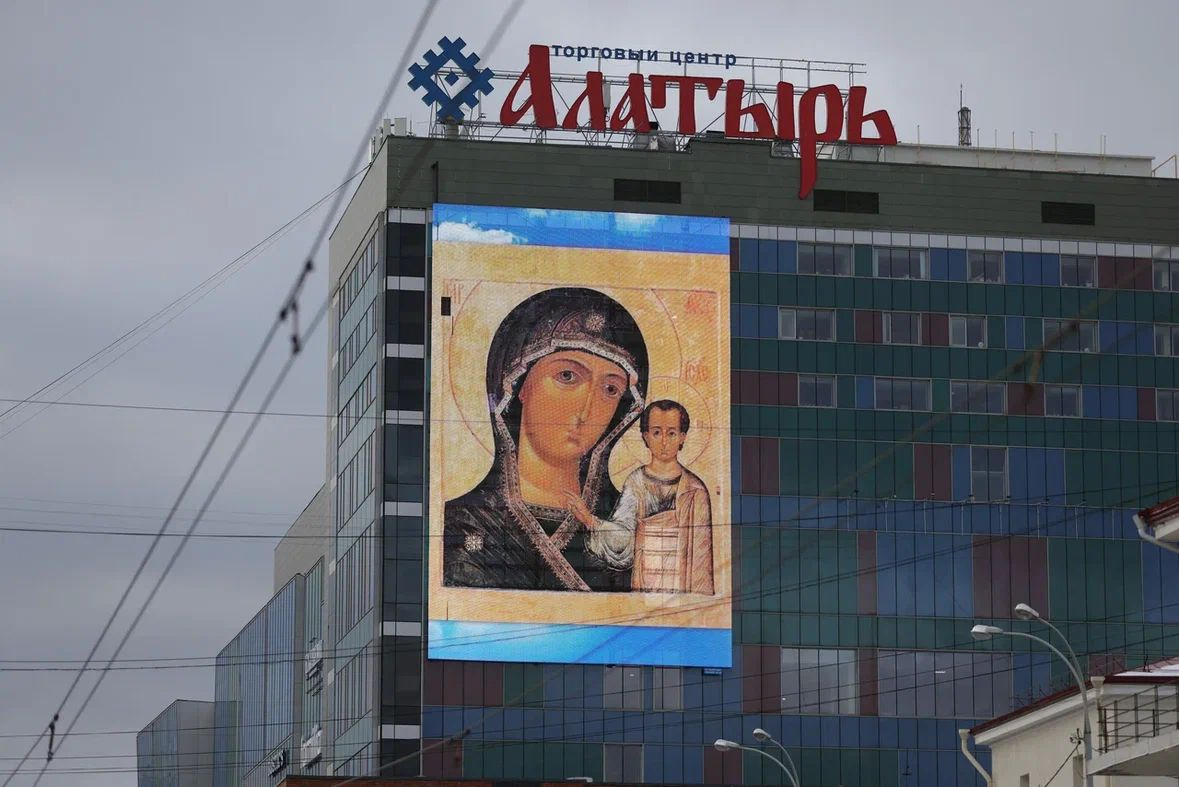 На всех центральных медиаэкранах города до конца дня можно будет изображение иконы казанской Божьей Матери и поздравления с праздником от Фонда святой Екатерины.