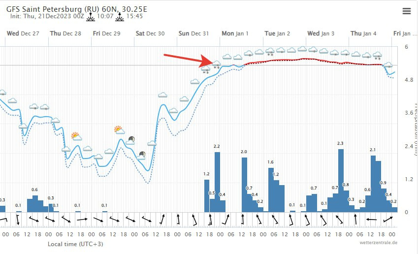 «Смотрите сами, очень интересные расчеты американской модели GFS в новогоднюю ночь в Санкт-Петербурге. Это не прогнозы, а возможные варианты развития атмосферных процессов над нашим регионом», — пишет синоптик.