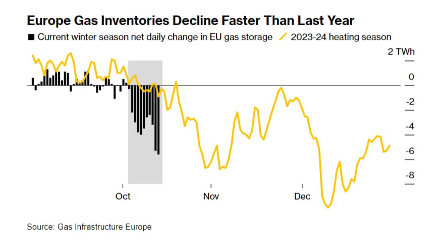 На этой неделе в Европейском союзе ускорился вывод запасов из хранилищ, достигнув уровня, который в последний раз наблюдался в январе — обычно в этом месяце в регионе наблюдается пик спроса на отопление, — показывают данные Gas Infrastructure Europe. Увеличение спроса было вызвано более холодной погоды в сочетании со снижением выработки электроэнергии из ветра. Ну вот так сейчас в некогда индустриальном гиганте: будет ветер – будем живы.