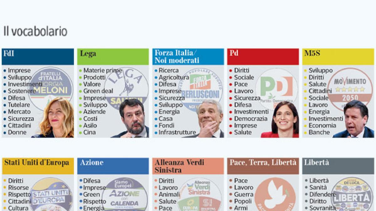 Stringato e corredato da diverse immagini il programma della Lega. Poco più di 2 mila parole in cui la matrice anti europeista impostata dal segretario Matteo Salvini trova conferma anche nella classifica del vocaboli. Termini che richiamano alla riscossa dello Stato sovrano nei confronti della burocrazia di Bruxelles, come materie prime, prodotti e il green deal (spesso bersaglio del Carroccio). E ancora, il pericolo Cina e il capitolo dei confini, toccato più volte con immigrati e immigrazione. Di nuovo economia, poi, nella lista di Forza Italia e Noi moderati. In un programma di poco meno di 2 mila parole, troviamo sviluppo ed energia, ma anche infrastrutture e agricoltura. Il progetto del ministro Antonio Tajani, inoltre, punta al 10% ricordando anche tematiche richiamate dai termini difesa e ricerca. E torna la casa, da sempre «vicina» al partito fondato da Silvio Berlusconi.