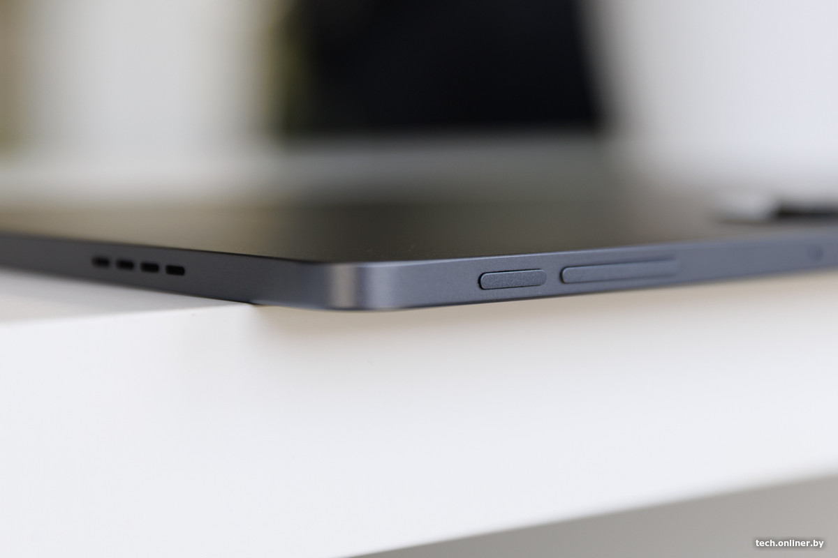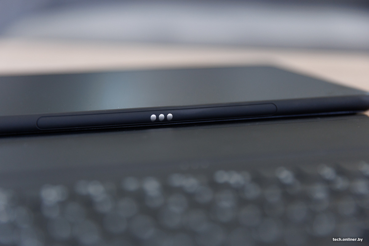 В ландшафтном режиме на верхнем торце находим микрофоны и качельку громкости, на левом — кнопку питания и пару динамиков, справа — еще два «гриля» для них с разъемом Type-C между ними. На нижнем торце располагается только контактная площадка для подключения клавиатуры-чехла.