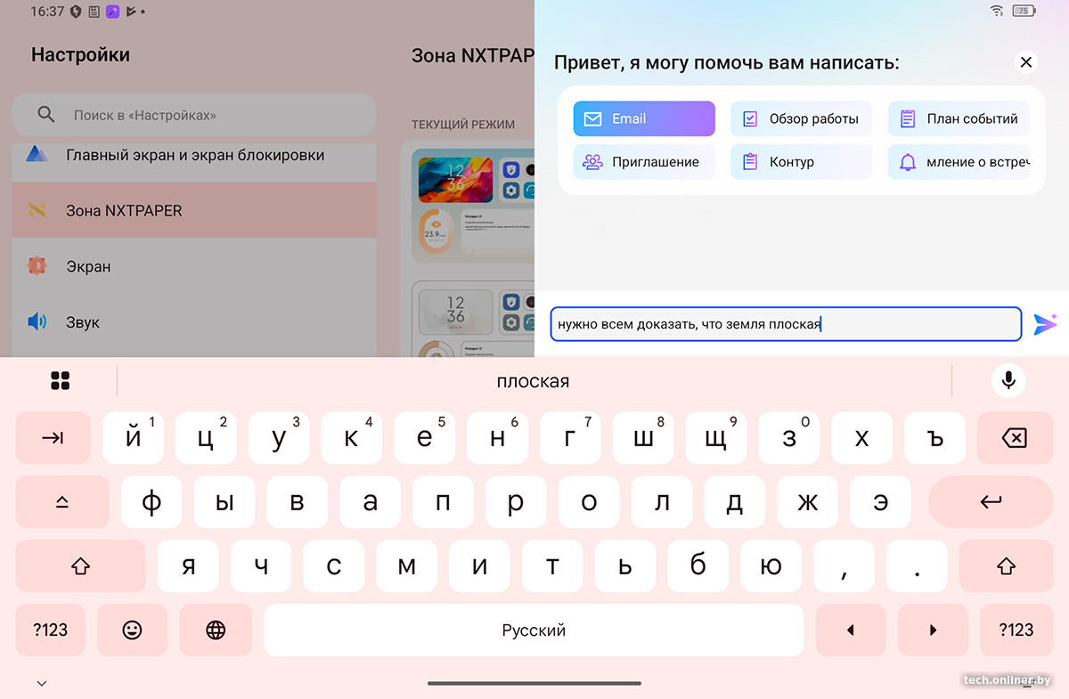 Работает планшет под управлением Android 15 с фирменной оболочкой TCL UI 8, интерфейс привычный для пользователей Android, однако есть и пункт меню «Зона Nxtpaper». Здесь можно выбрать между обычным режимом, режимом «цветной бумаги» и черно-белым.