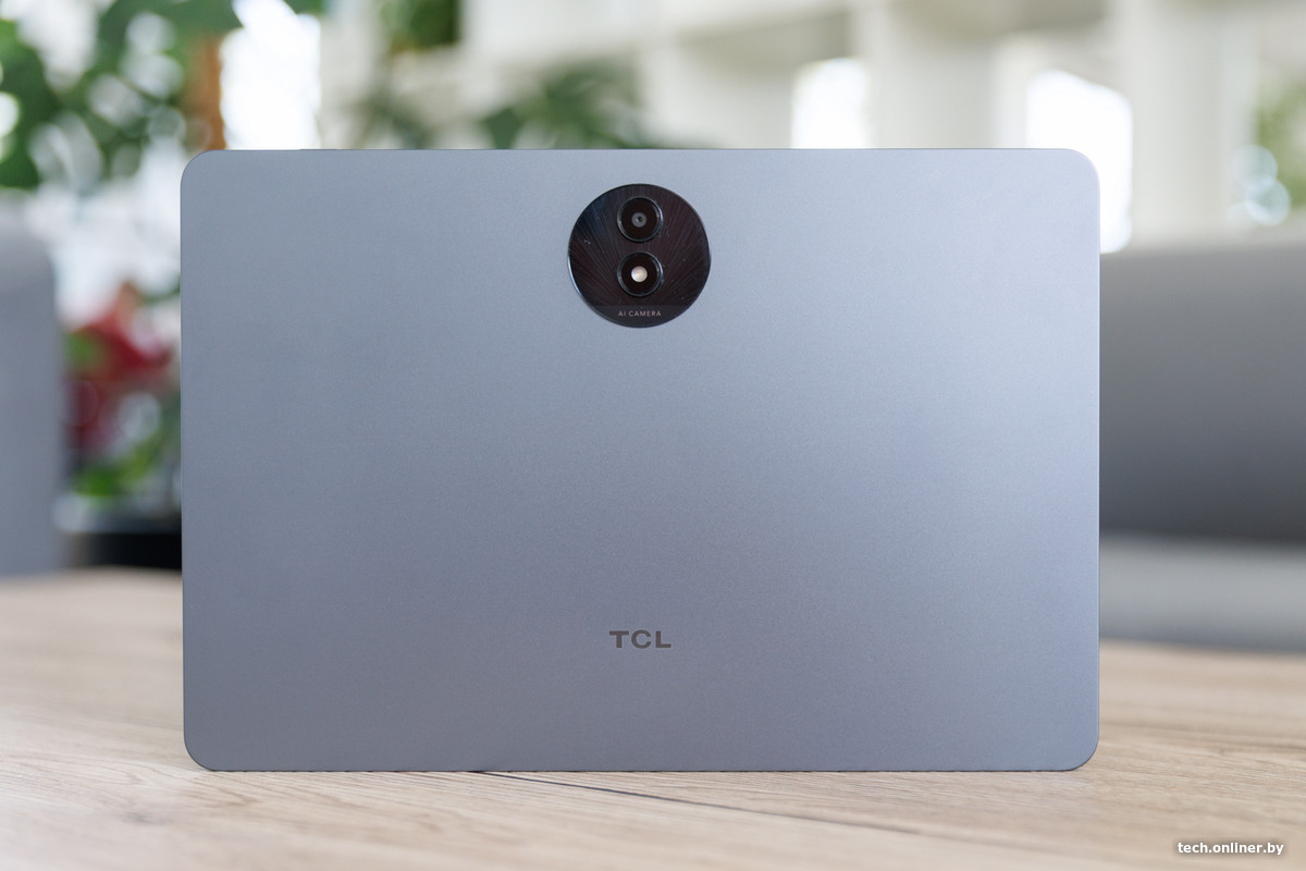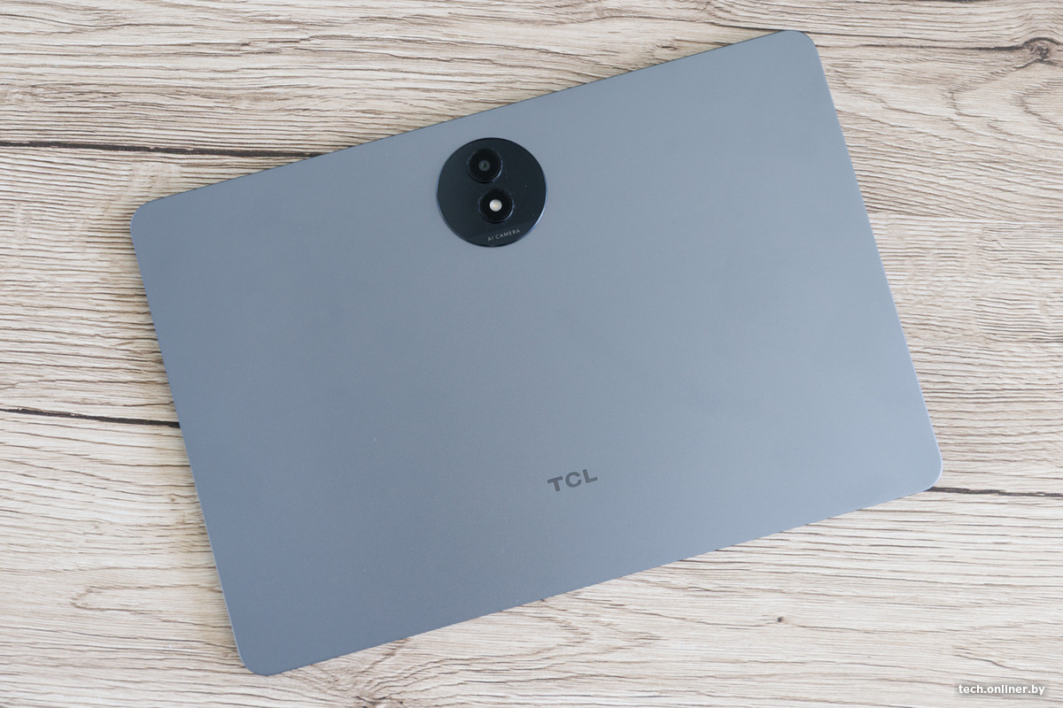 Планшет TCL получил цельнолитой (без пластиковых вставок для работы антенн) металлический корпус толщиной 6,5 мм с плоскими гранями и закругленными уголками. На левом торце, если держать девайс в ландшафтном режиме, размещена пара «грилей» динамиков, на правом — два таких же, с разъемом Type-C между ними. На верхнем торце находится пара отверстий микрофонов, ближе к левому краю — кнопка включения и качелька громкости, ближе к правому — еще одна клавиша с подсветкой.