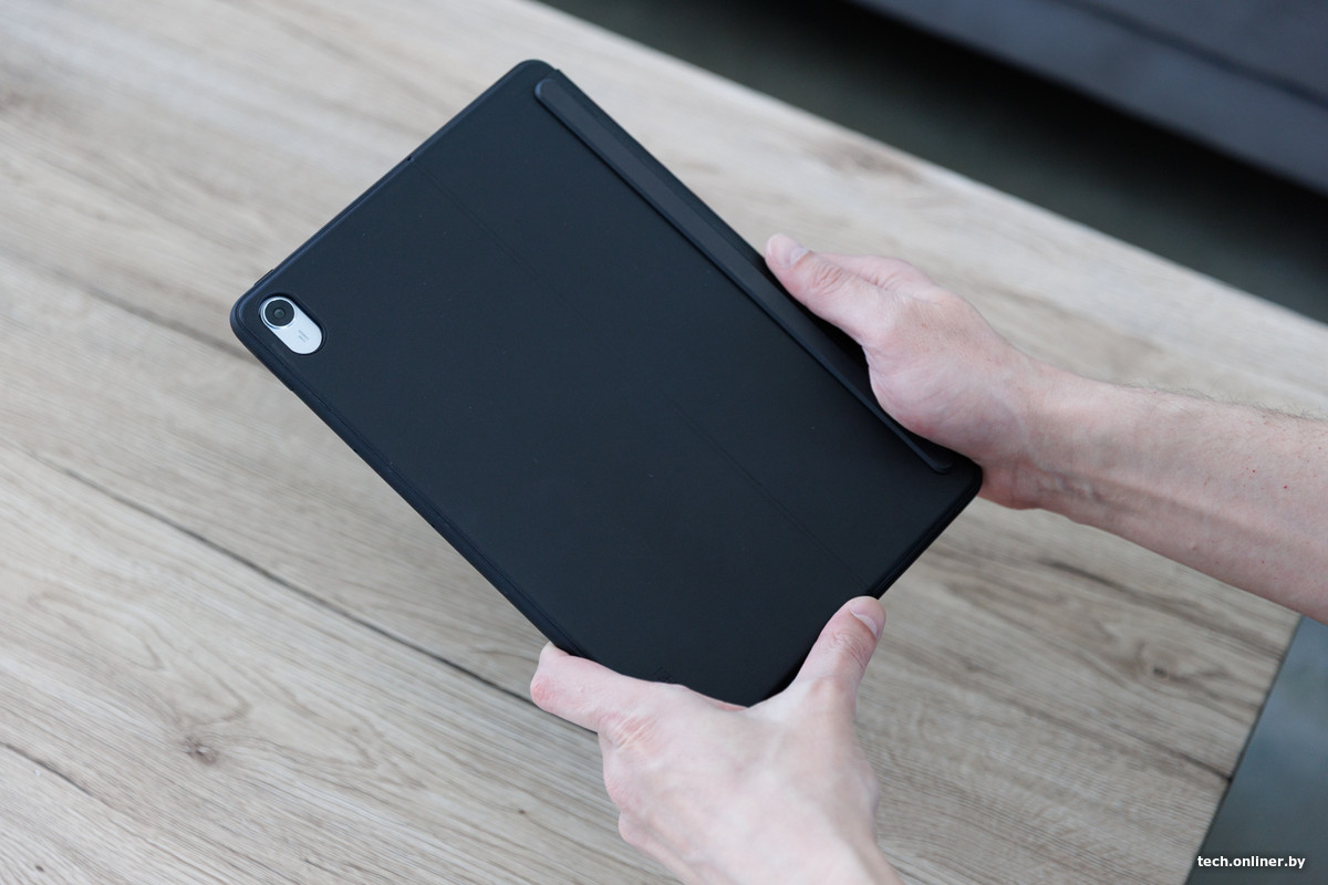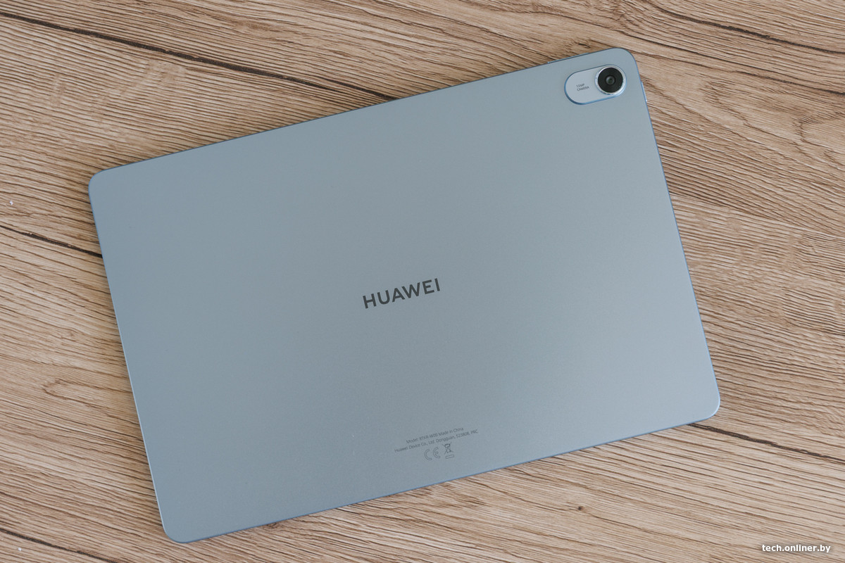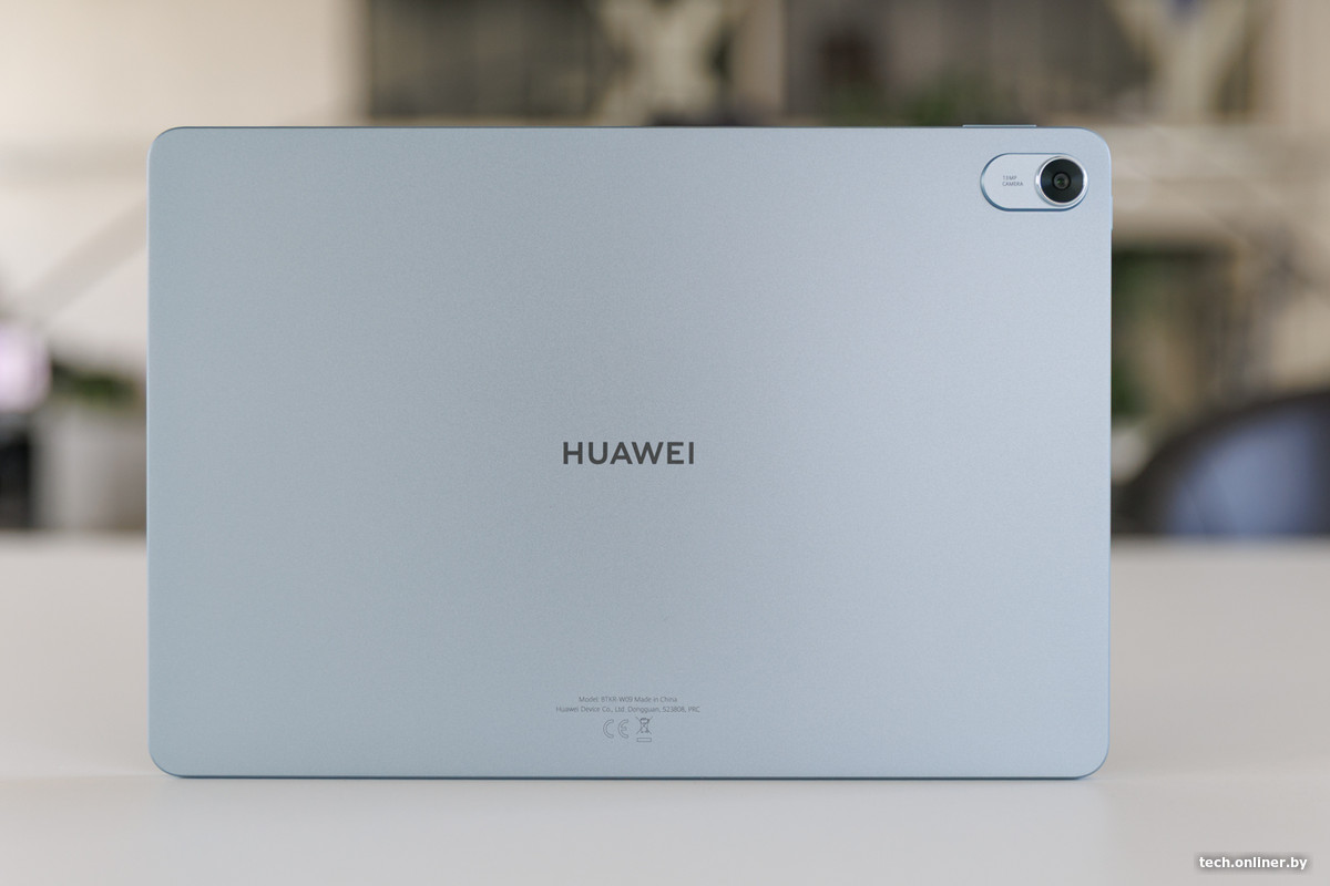 Рамки вокруг дисплея тонкие (для планшета), фронтальная камера находится за пределами экрана. Задняя панель минималистичная: есть совсем небольшой фотомодуль основной камеры и логотип Huawei по центру. Пьедестал занимает минимальную площадь, но поднимается над корпусом заметно.