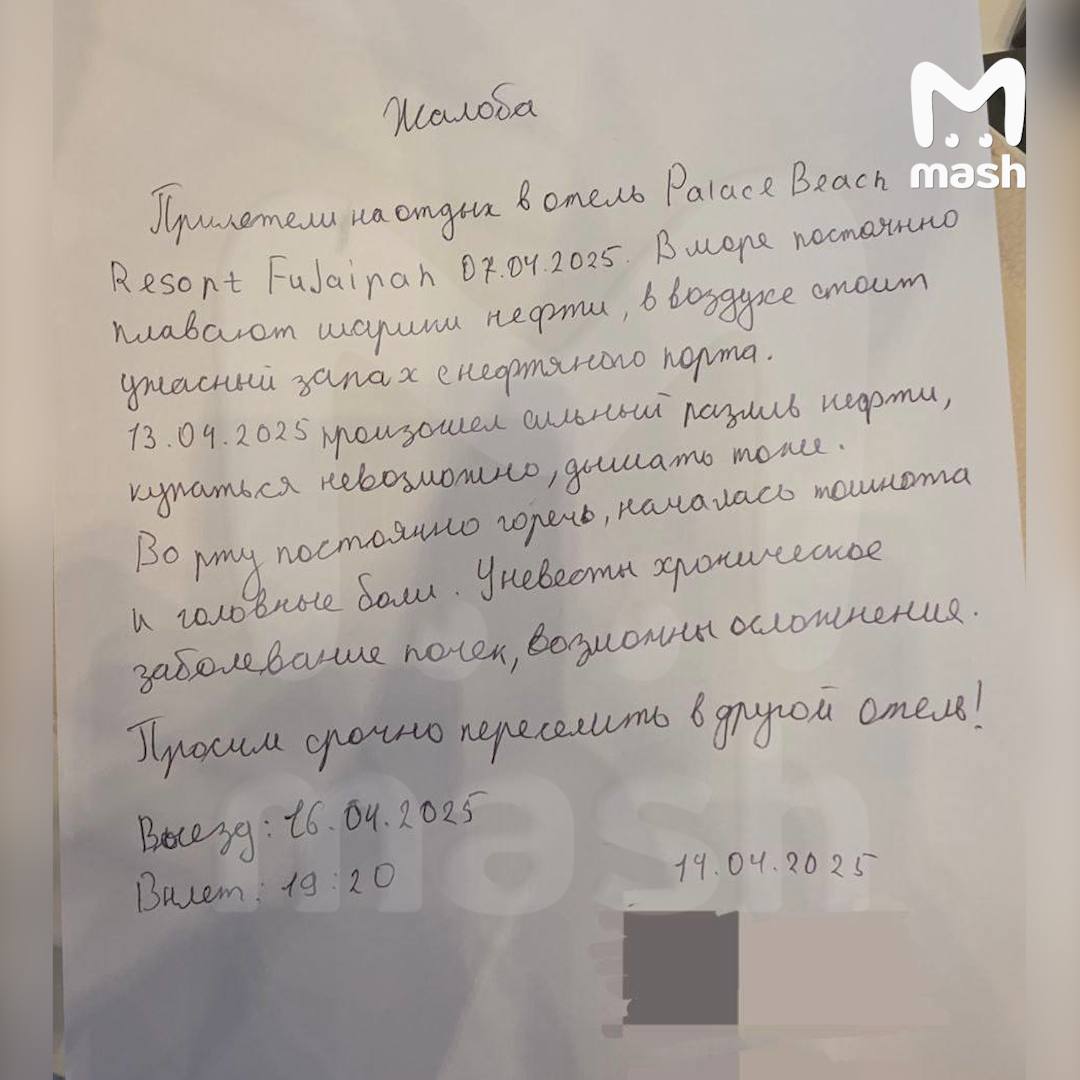 Десятки россиян, которые отдыхают на побережье Фуджейры, пострадали от мазута в Оманском заливе. Они жалуются на тошноту, головные боли и горечь во рту. С их слов, в отелях на это никак не реагируют.