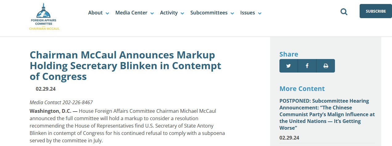 ❗️На сайте органа сказано, что Блинкена обвиняют в отказе «выполнить требования, направленные комитетом». Заседание запланировано на 7 марта, хотя вряд ли по его итогам госсекретарю грозит какое-то серьезное взыскание.