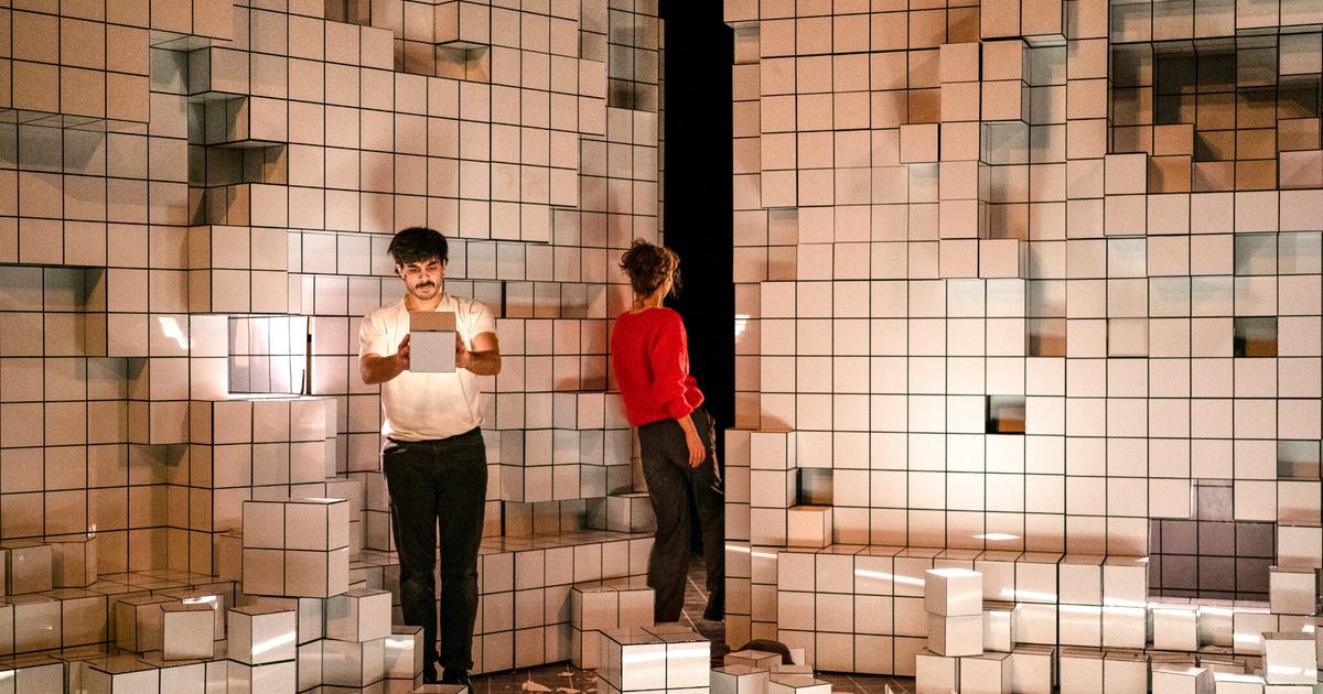 Son dispositif scénique intrigue. Un mur de cubes blancs, tout en reliefs. En dehors de deux portants à cour et à jardin vers lesquels les acteurs marchent sur le rythme d’une musique techno pour y décrocher des vêtements, le décor se résume à ces cubes de céramique tous de taille égale. Une sorte de marionnette selon Bérangère Vantusso, que les personnages transforment puisqu’ils utilisent des éléments au fil du récit. Les cubes deviennent ainsi chat, verre de pastis, lit, porte… Et sont fracassés pour dépeindre la mort du chat, la fureur, l’angoisse des habitants face aux rhinocéros de plus en plus nombreux. Le mur sert ensuite à séparer ceux qui se transforment en pachydermes et ceux qui résistent.