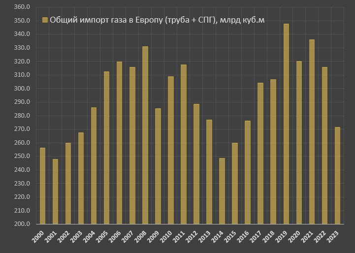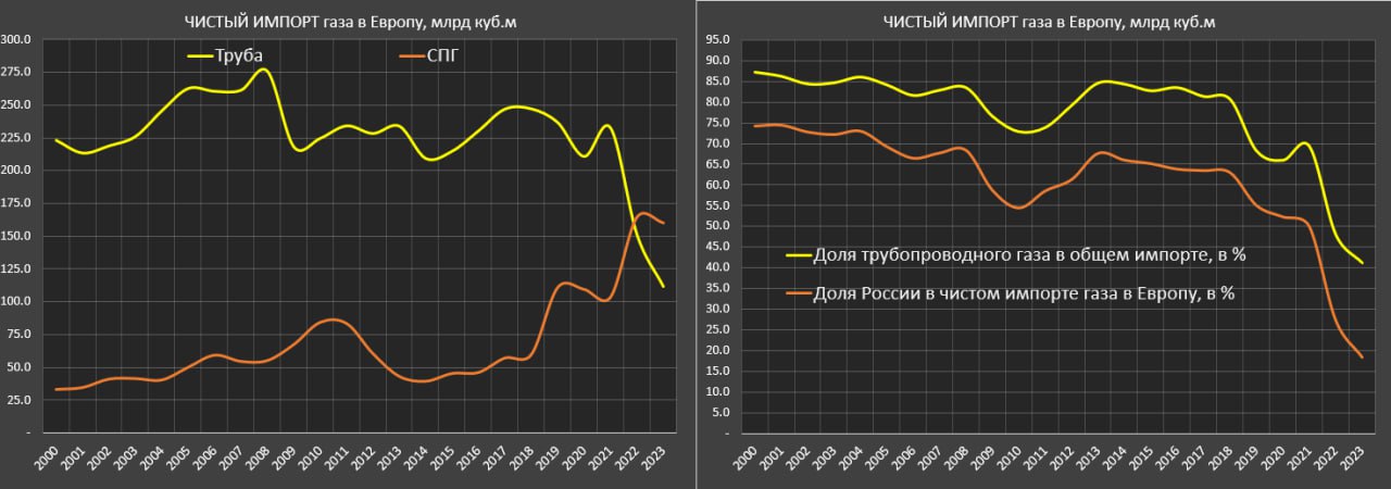 Сейчас доля импорта газа через трубу составляет всего 41% vs 48% в 2022, 69.3% в 2021, в среднем 77.6% в 2011-2021 и 84.5% в 2000-2008.