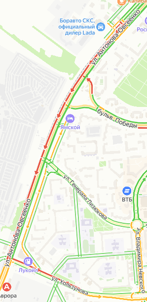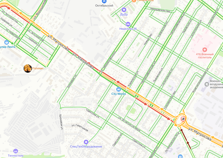 Кроме того замедлилось движение по улице Матросова в сторону Ворошилова.
