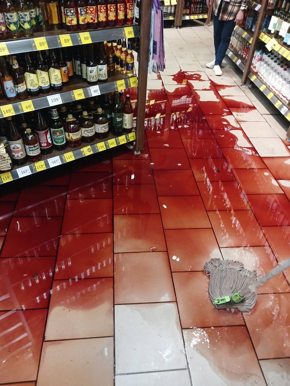 Если что, на фото — не реки крови, а всего лишь литры алкоголя, от которых крушитель, видимо, решил избавить Егорьевск. Намерение — благородное, но придётся возместить ущерб. Буйного уже задержала полиция.