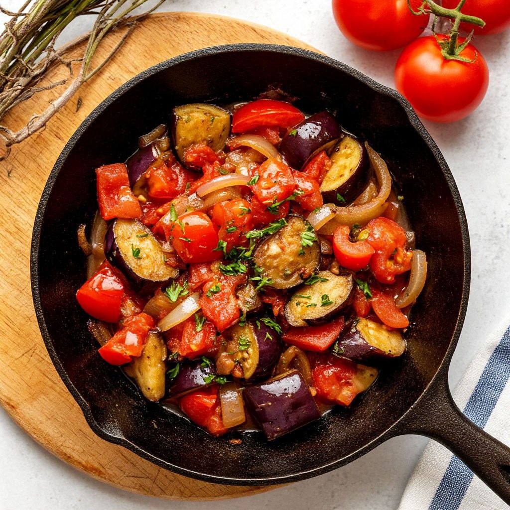 5. В глубокую сковороду сложите баклажаны вместе с луком. Залейте томатным соусом.