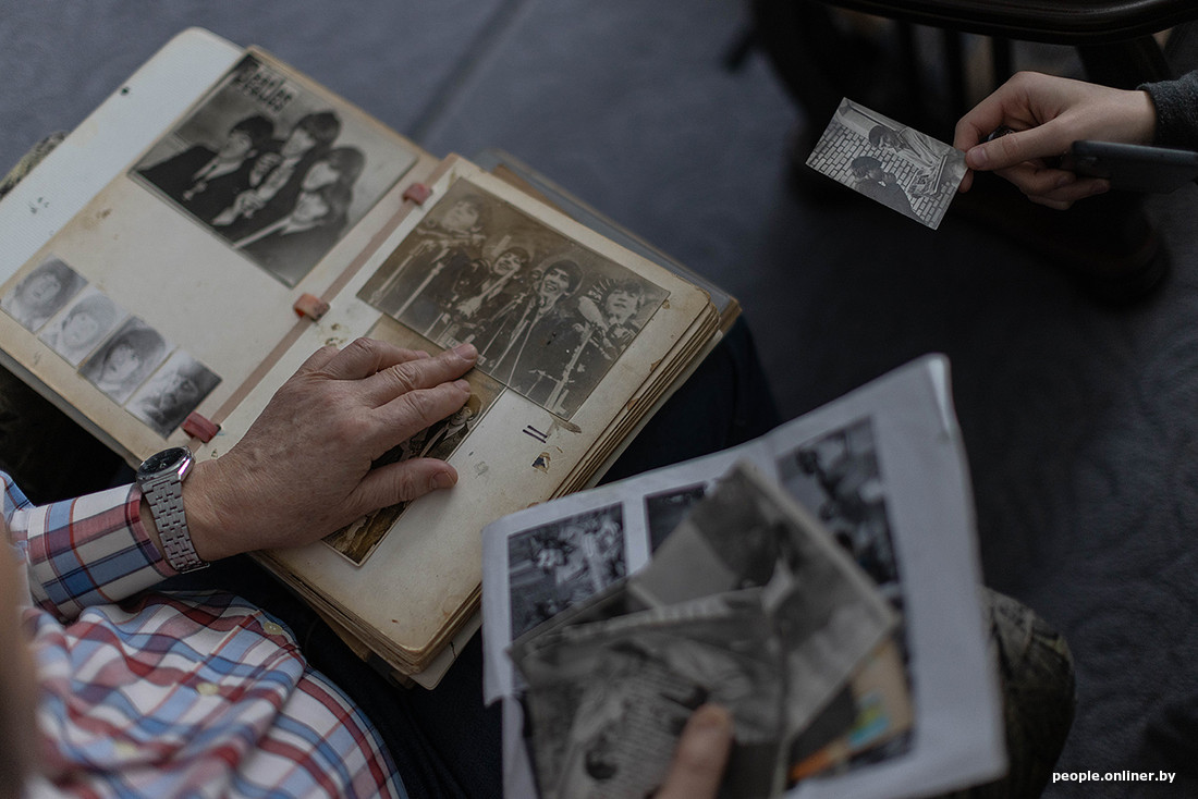 Тем не менее, несмотря на опасность, у Олега дома часто собиралась большая компания ценителей музыки. Ребята веселились, обменивались винилом, журналами и даже самиздатом книг — биографий любимых групп. Не Солженицын, конечно, но звучит тоже серьезно. Мужчина показывает фотографии.