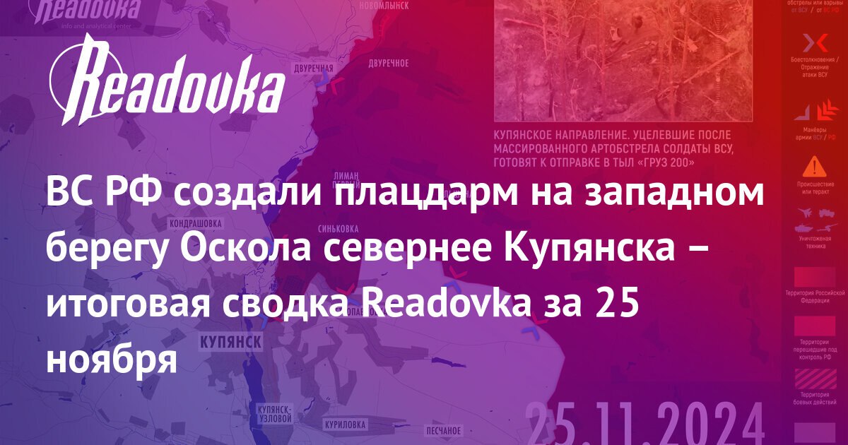 ВС РФ создали плацдарм на западном берегу Оскола севернее Купянска – итоговая сводка Readovka за 25 ноября